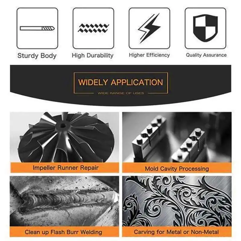 ➜VERSATILE:Широко используется дляМеталлообработка, сварка, резьба по дереву, модельная техника, изготовление ювелирных изделий, заусенцев, шлифовка, портирование головки цилиндра и скульптура.