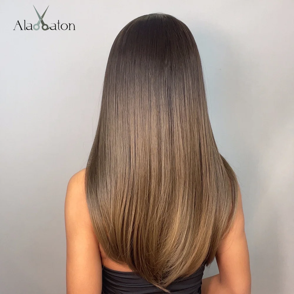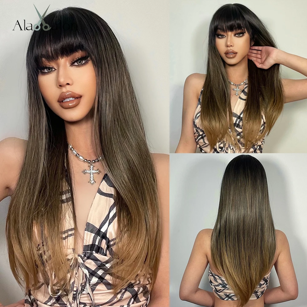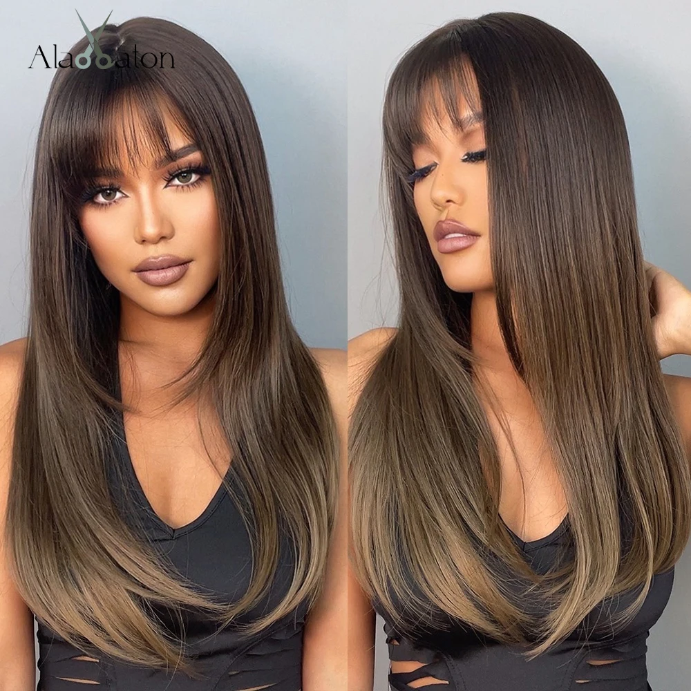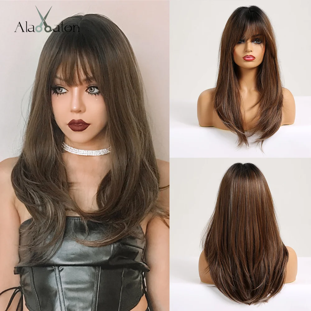 Темно-коричневый синтетический парик с челкой ALAN EATON, шелковистый прямой длинный женский парик для ежедневного косплея, вечеринки, термостойкий