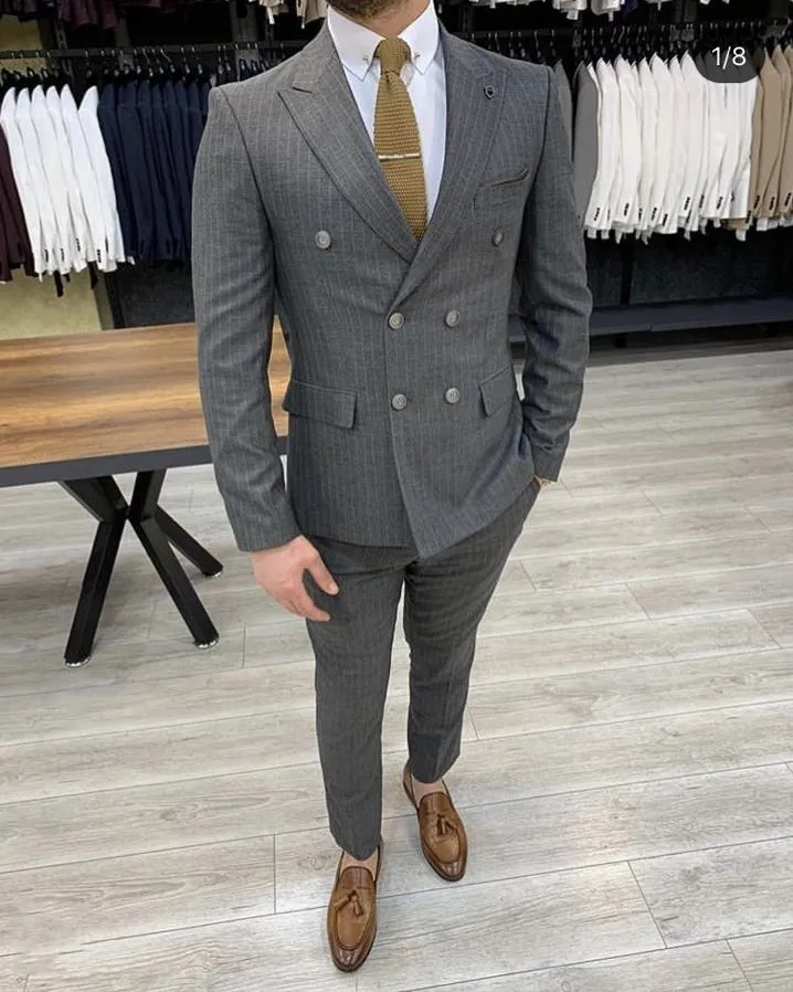 Мужские костюмы в полоску, серые двубортные деловые повседневные облегающие Свадебные смокинги для жениха, костюм на выпускной (пиджак + брюки)