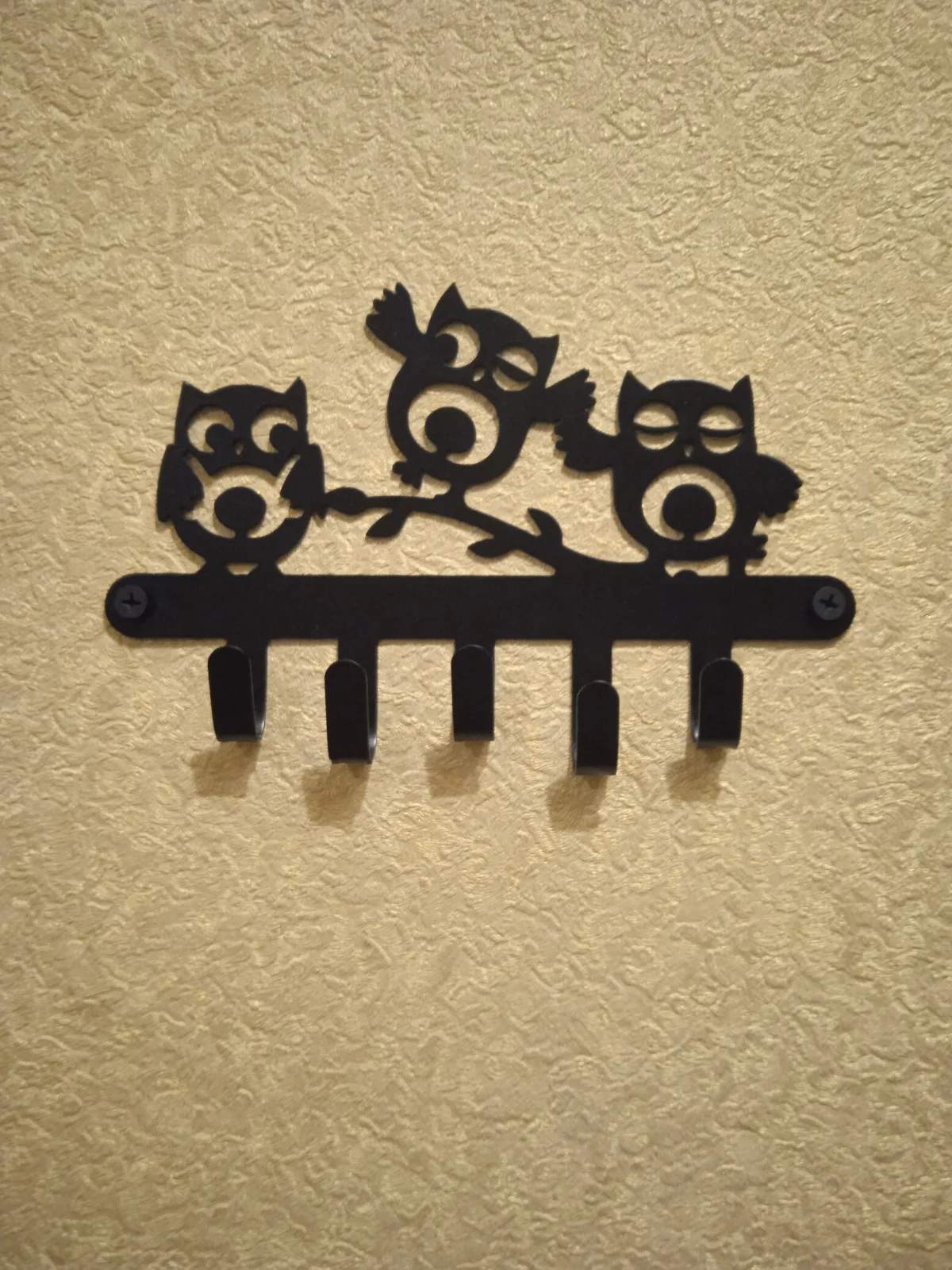 Металлическая настенная ключница с симпатичными Совами прекрасно впишется как предмет интерьера в любой дизайн дома, квартиры или дачи. Ключница изготовлена из металла как вешалка на стену с 4 крючками и покрыта порошковой краской черного цвета. Крепление на стену предусмотрено с помощью двух саморезов, которые идут в комплекте. Ключница отличный подарок на любой праздник. Подойдет как мужчине или женщине, родственникам или друзьям. А также в качестве презента без повода, просто так.