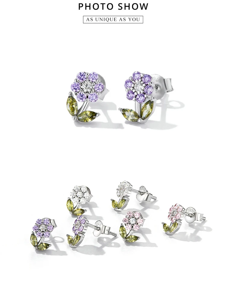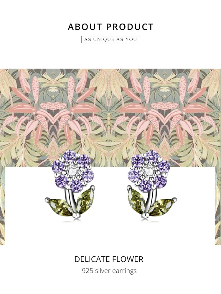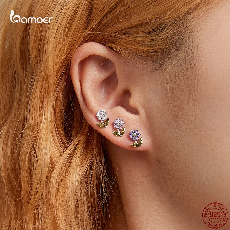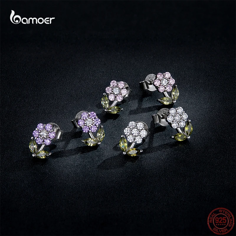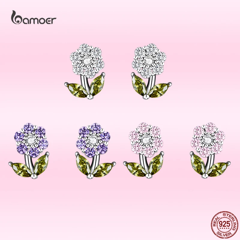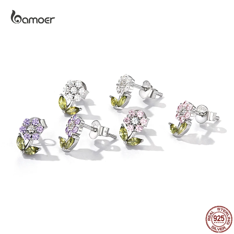 Женские серьги-гвоздики Bamoer из настоящего серебра 925 пробы с нежным цветком и разноцветным цирконием, ювелирные украшения S925