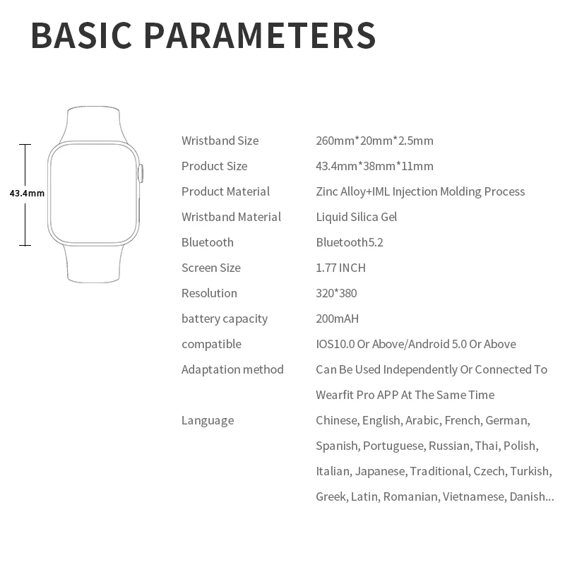 Система требует: android5.0 + / ios10.0 + Основной ChipsHs6621 Память браслета: 128 м Bluetooth-совместимый чип: AB5376A2 Версия Bluetooth: 5,2 Экран: 1,77 inch 320 * 380-TFT Емкость аккумулятора: 200 мАч Время работы в режиме ожидания: 7 дней Время использования: 2-3 дня