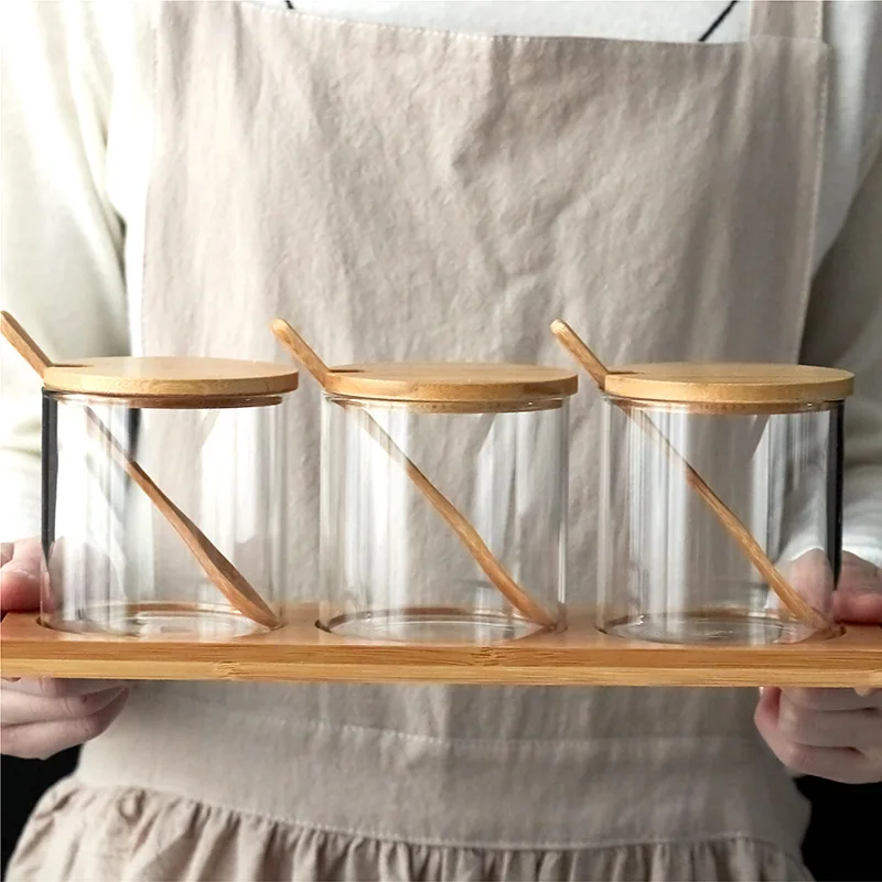 Стеклянная банка для хранения, 3 шт. в наборе, соль, конфеты, печенье, чай, кофе, зерна, органический деревянный контейнер с крышкой, специи, основа для пищевых продуктов, хлопьев