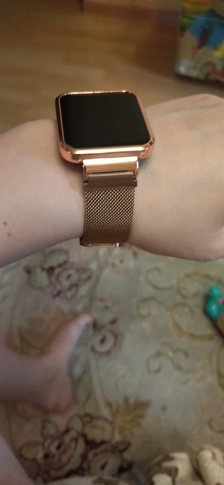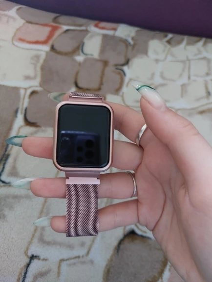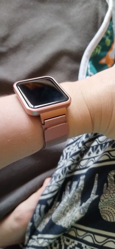Ремешок хороший, не пластик, одевается легко. Думала будет чуть шире ремешок, но и так хорошо смотрится на руке. Покупкой в целом довольна)
