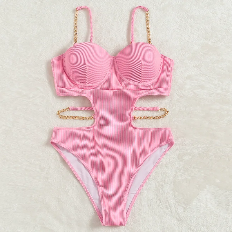 Сексуальный цельный купальник на косточках женский однотонный розовый ажурный металлический ремешок-цепочка ребристый купальный костюм с открытой спиной купальник Монокини