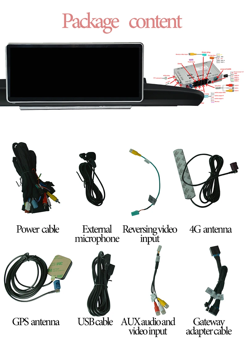 1x Android навигация и мультимедийный плеер дисплей1x Кабель питания1x RCA кабель для камеры резервного копирования.1x USB кабель (3x)1x GPS антенны1x3,5 мм кабель с соединителем для подключения к разъему Aux.1x3,5 мм внешняя mirophone кабель.1 счет-фактура + 1 год гарантии