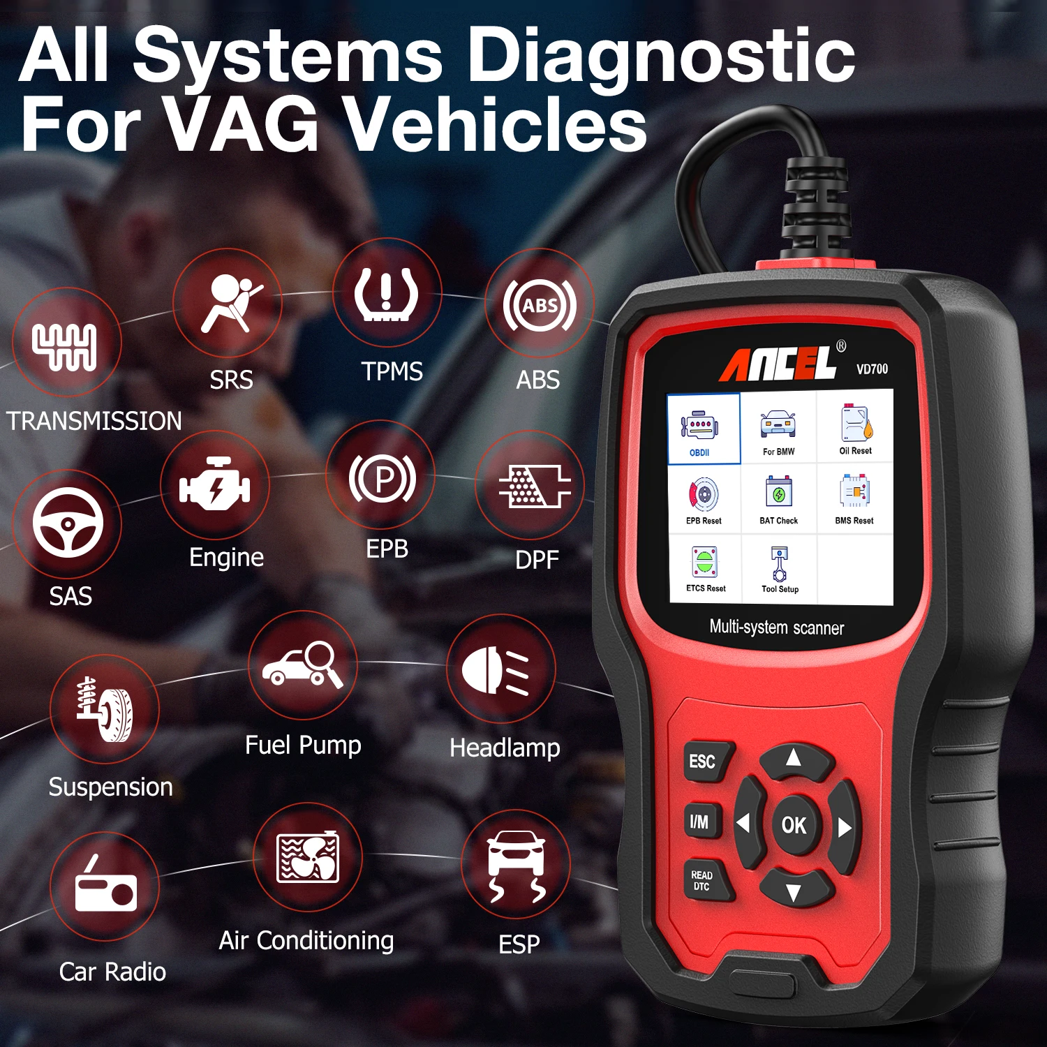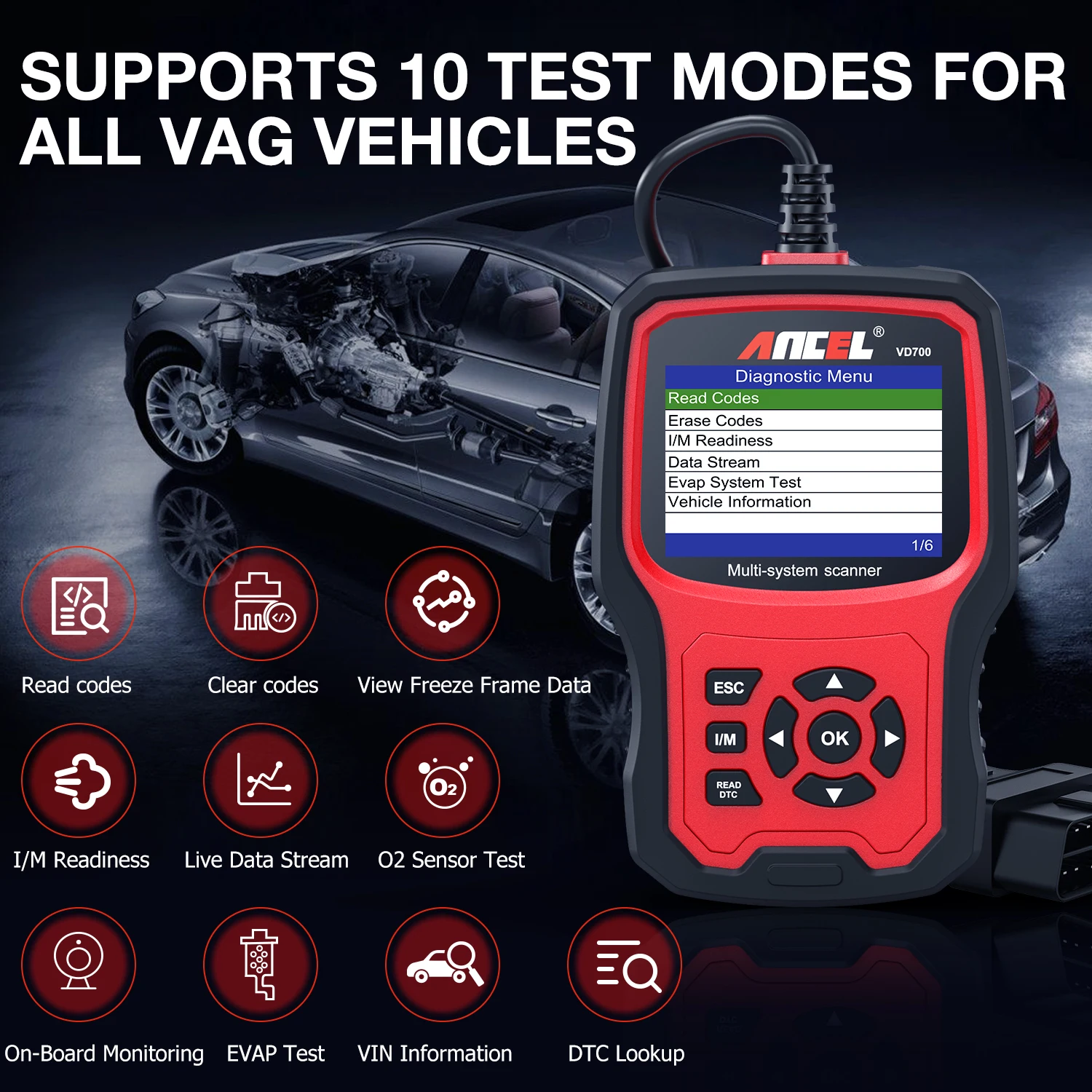ANCEL VD700-это обновленная версия сканера ANCEL VD500 OBD II. Он специализируется на диагностике автомобилей Volkswagen Group (для VW / AUDI / SKODA / SEAT), он может диагностировать все системы (такие как ABS, трансмиссия, SAS, SRS, ESP, TPMS и другие системы) и специальные функции (такие как адаптация положения дроссельной заслонки, сброс тормозных колодок, сброс TPMS, Обучение углу рулевого управления, сброс масляного сервиса, обучение инжектору, регистрация батареи и Сброс DPF и т. д.) для автомобилей VAG. Он поставляется с расширенным STM Процессор, 2 цвета темы пользовательского интерфейса 2,8-дюймовым экраном, 11 языков дисплея и специальный отзывы функция. Он может диагностировать ваш автомобиль всего за несколько секунд из-за его функции автоматической идентификации модели транспортного средства. Мы также предоставляем бесплатные обновления в течение всего срока службы, чтобы убедиться, что у него всегда есть последняя база данных кодов неисправностей.