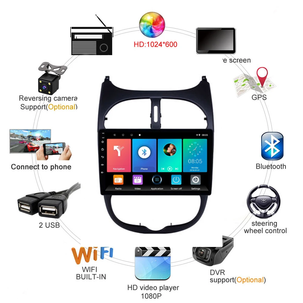 2 din Car Radio AndroidFor Peugeot 206 2000 -2016