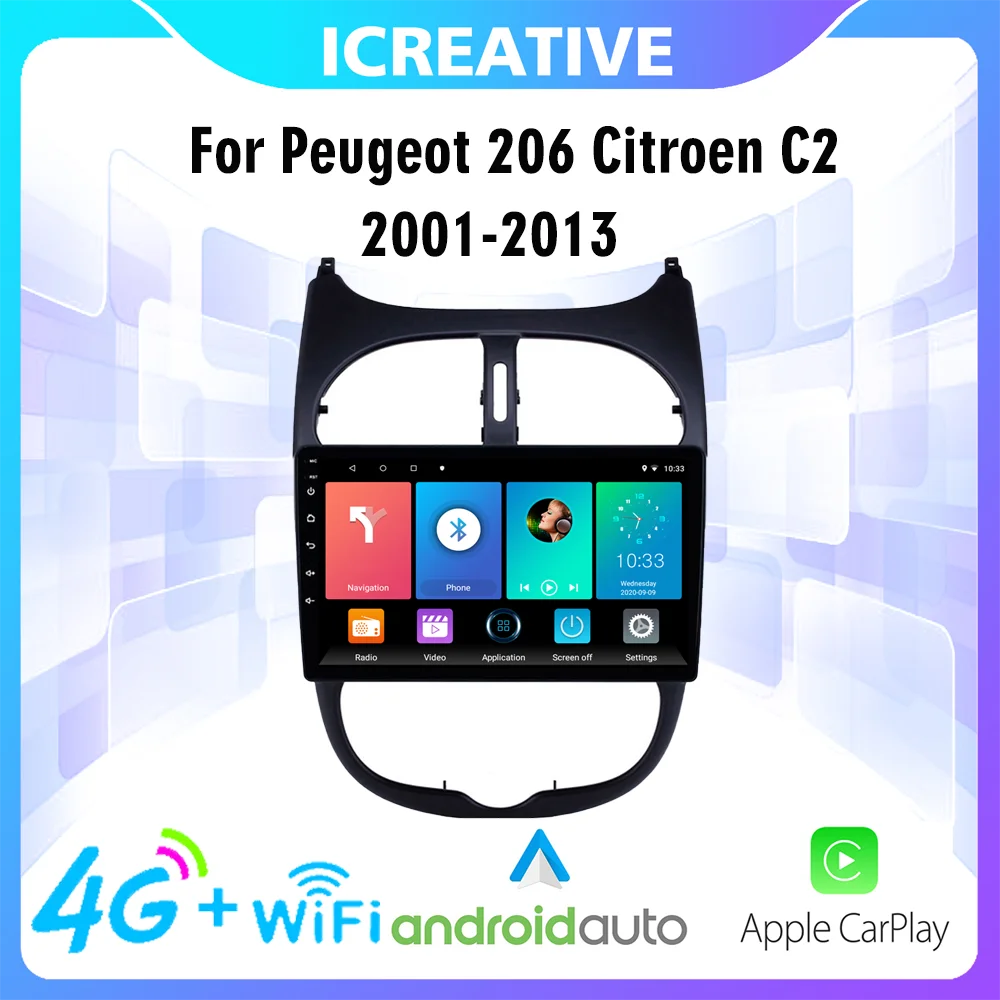 Автомобильный мультимедийный плеер, 2 Din, 9 ", 4G, Wi-Fi, для Peugeot 206, Citroen C2, 2001 -2013, Android, GPS-навигация, FM, стерео, Carplay