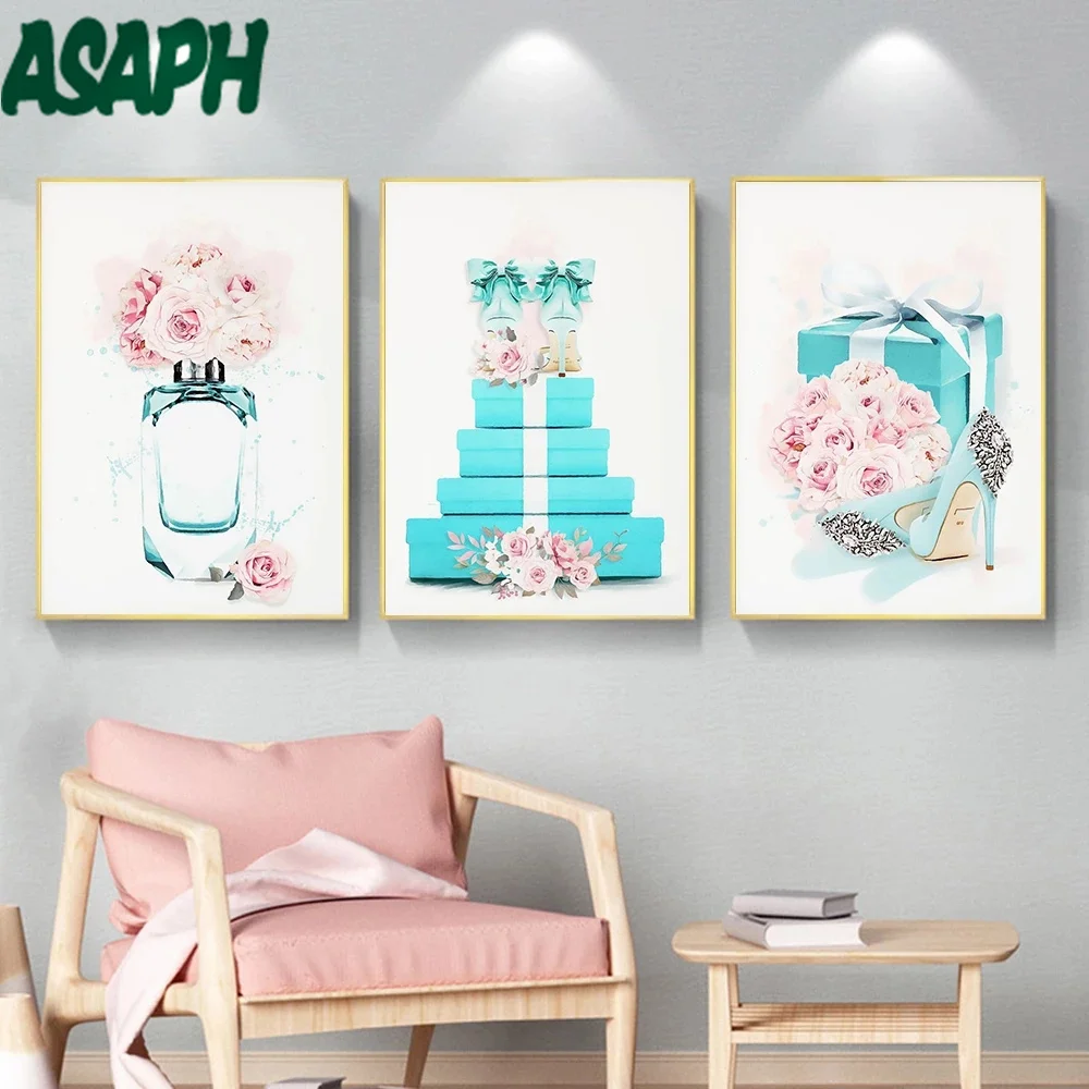Духи высоких каблуках с украшением в виде цветка, подарок Коробки Синий Розовый плакат Модульная картина Cancas м...
