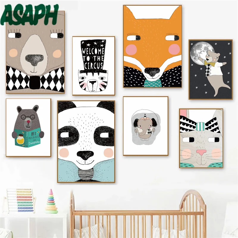 Милый медведь, кролик, лиса, панда, забавные глаза, восхитительный мультяшный постер, настенное искусство, Pi...