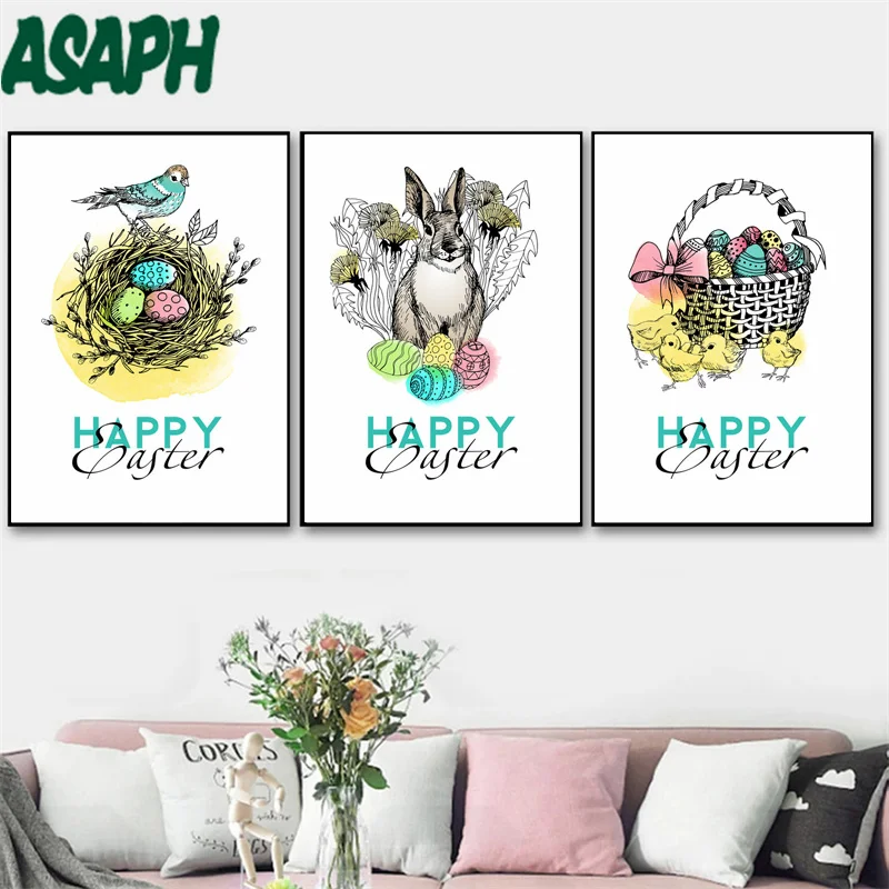 Минималистский счастливый Пасхальный корзина в форме кролика птицы яйца цвет плакат Холст Картина Хол...