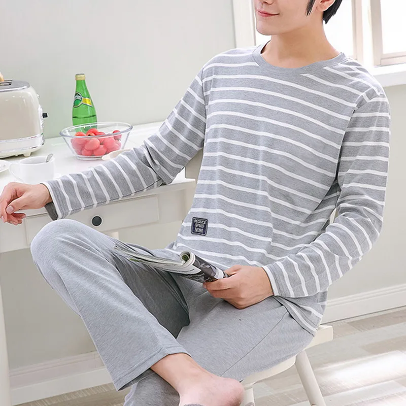 Весенне-осенние мужские пижамные комплекты, хлопковые пижамы с длинным рукавом, повседневный мужской пижамный комплект, женская одежда для сна