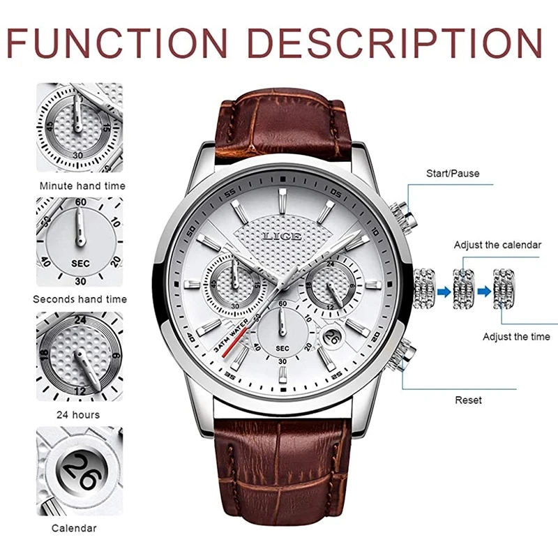 Мужские часы 2021 LIGE Лидирующий бренд Роскошные повседневные кожа...