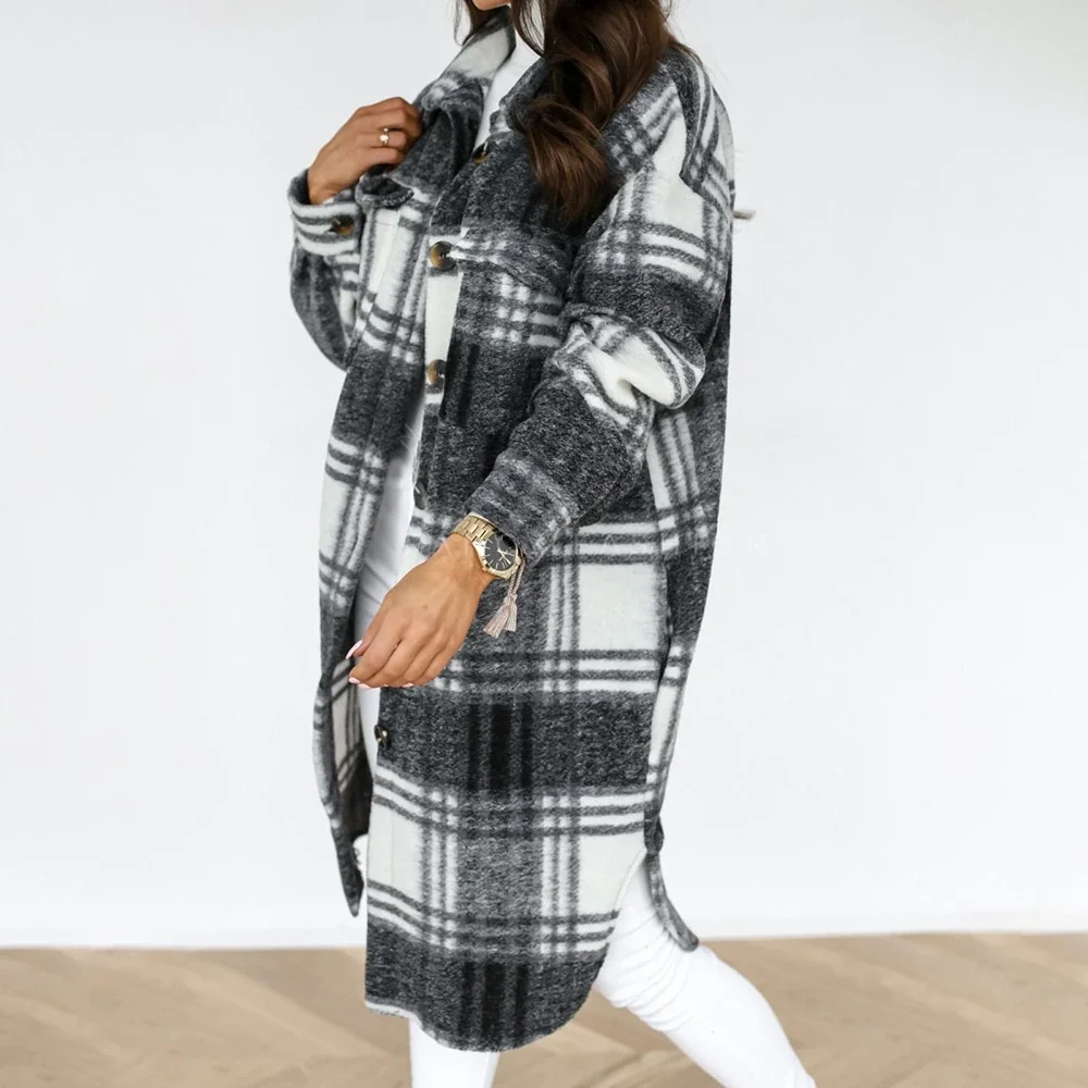 Зимняя женская куртка в клетку, повседневное длинное пальто большого размера с отложным воротником, женское толстое теплое пальто из смешанной шерсти, уличная одежда, 2022