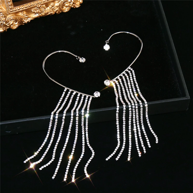 Модные длинные блестящие серьги-клипсы Стразы с кисточками из цирко...