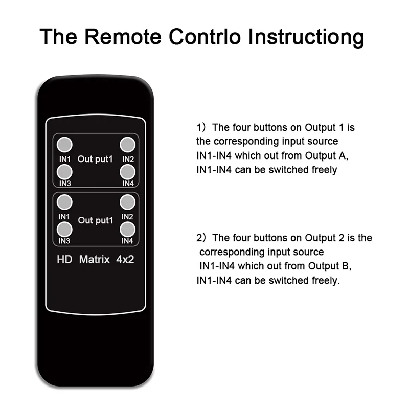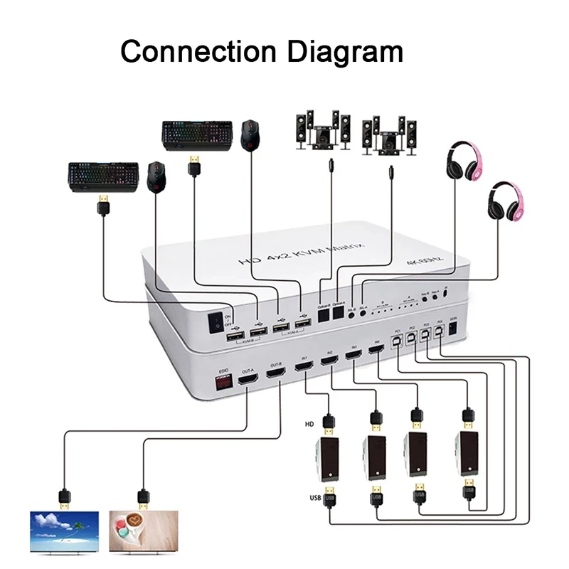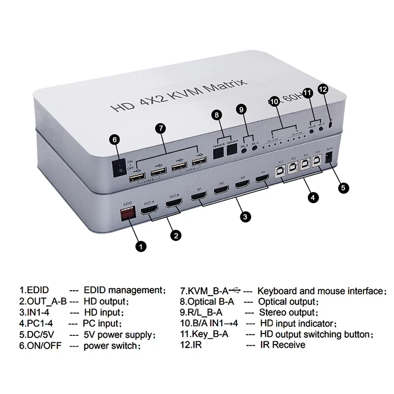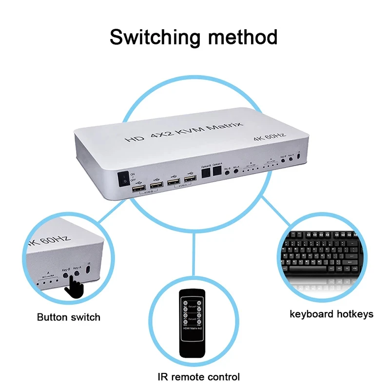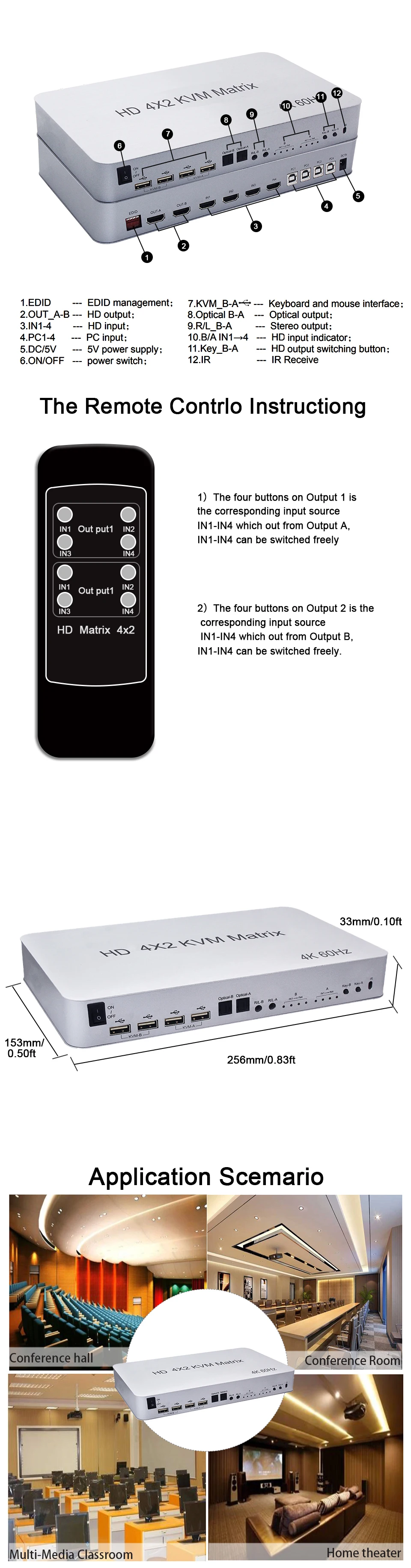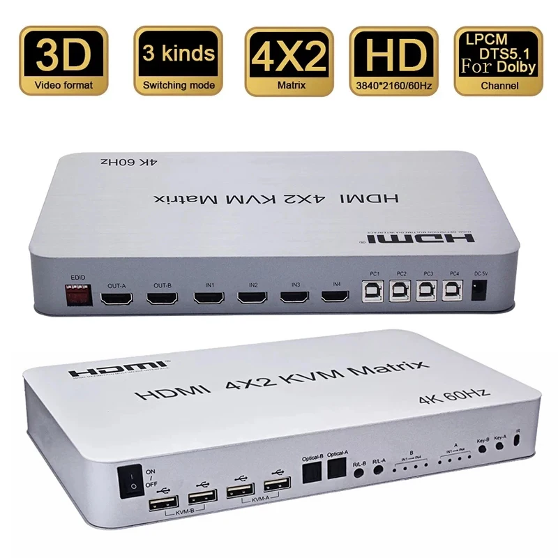 Эта матрица KVM HD 4X2 может переключаться между 4 устройствами источника входного сигнала и распределять сигнал на 2 монитора (2 монитора могут отображать одно и то же изображение или разные изображения) И любой выход все порты могут осуществлять независимый аудиовыход через оптический SPDIF или 3,5 мм аудио разъем.4-портовая матрица KVM может управлять 4 компьютерами с двумя наборами клавиатуры, мыши и двумя мониторами и поддерживает различные устройства с интерфейсами HDMI.3. Поддержка HD 2,0 и HDCP 2,2. Разрешение до 4K @ 60Hz (RGB/YUV 4:4:4), что позволяет наслаждаться фантастическим визуальным праздником.4. Оснащен 4 usb-кабелями, чтобы решить ваши проблемы с покупкой usb-кабелей, поддерживает 3 режима переключения, переключение кнопок, переключение дистанционного управления, переключение клавиатуры.5. Эта матрица HD 4X2 KVM подходит для развлекательных центров, розничной торговли и веб-сайтов, телевизионных приставок высокой четкости, dvd-дисков, проектных заводов, управления центром обработки данных, распространения информации, конференц-залов, школы и корпоративные условия обучения.