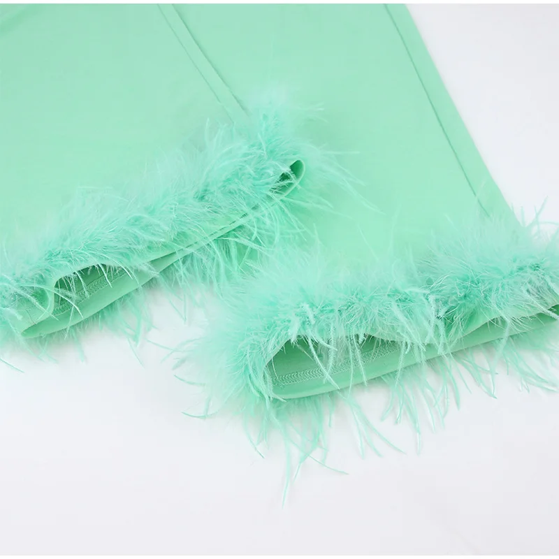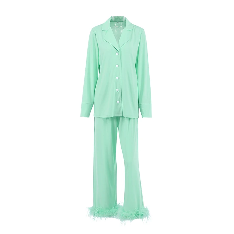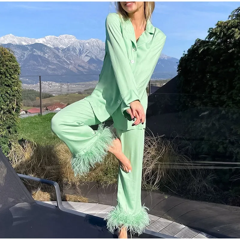 Женский комплект из двух предметов с перьями, Весенняя модная зеленая пижама с длинным рукавом, повседневная Летняя женская одежда, 2022