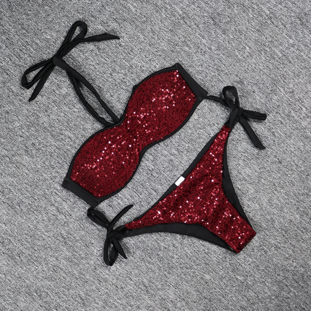 Женский Блестящий купальник бандажный Топ, бикини купальный костюм с пуш-ап, купальник со шнурком, яркий купальник, блестящая пляжная одежда, бикини Maillot