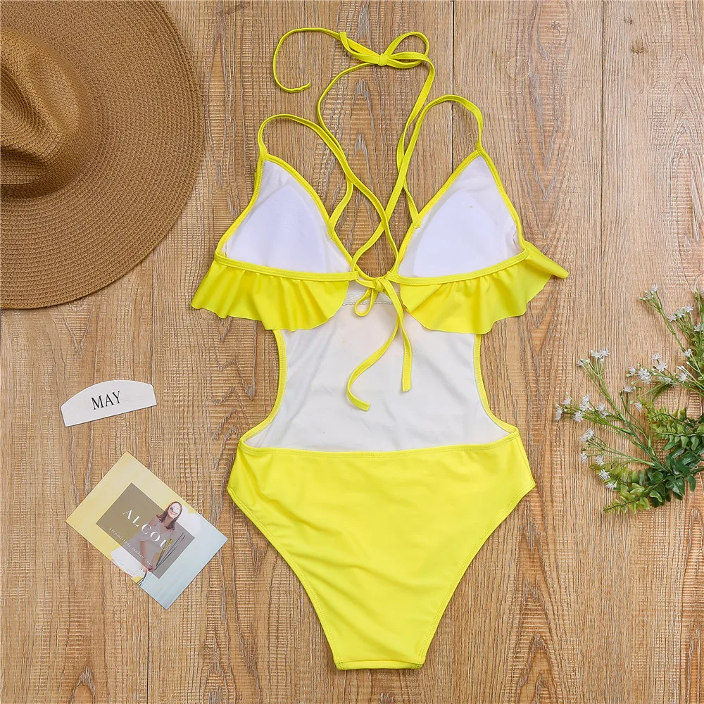 Женский слитный купальник, однотонный Желтый купальный костюм с оборками, пляжная одежда, 2022