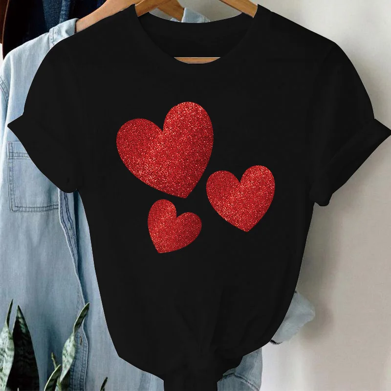 Одежда для женщин с принтом сердца, летняя простая базовая одежда с круглым вырезом, женские топы, тканевые футболки, Женская Повседневная футболка, футболка