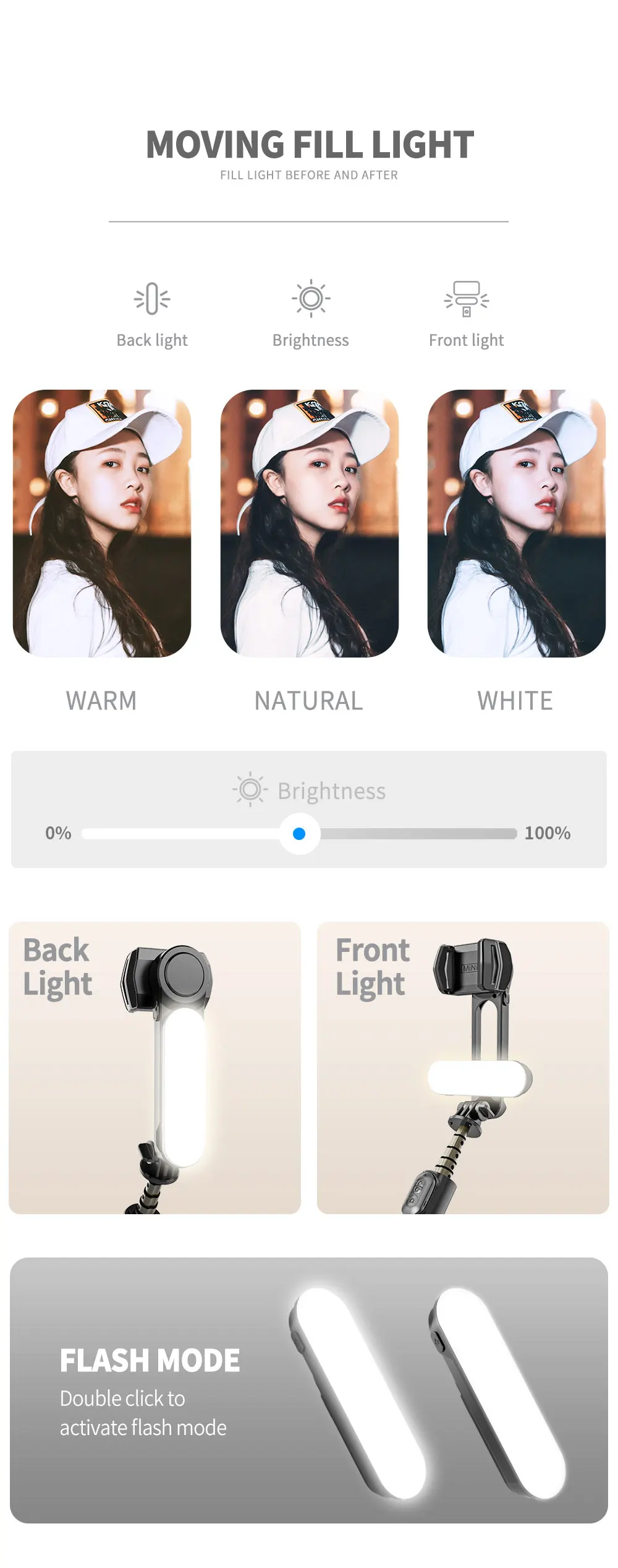 Материал: алюминиевый сплав и АБС-пластикРазмер в складку: 151 ммРазмер стрейч: 700 ммИспользование карданного шарнира: 2hСветильник: 120 минКарданный аккумулятор: 400 мАчСветильник аккумулятор: 600 мАчВес: 210 г