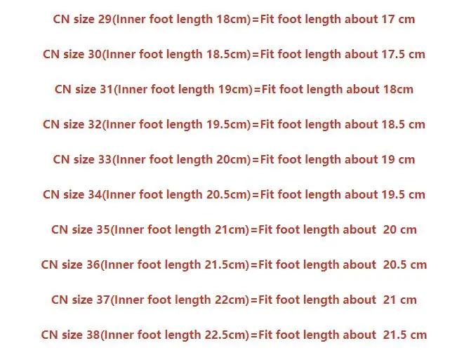 Размер CN 29 (Длина внутренней стопы 18 см) = длина стопы около 17 см Китайский размер 30 (размеры соответствуют внутренней длине стопы 18,5 см) = соответствует европейскому размеру длины стопы около 17,5 см Размер CN 31 (Длина внутренней стопы 19 см) = длина стопы около 18 см CN Размер 32 (размеры соответствуют внутренней длине стопы 19,5 см) = соответствует европейскому размеру длины стопы около 18,5 см Размер CN 33 (Длина внутренней стопы 20 см) = длина стопы около 19 см На высоком каблуке размеры 34 (размеры соответствуют внутренней длине стопы 20,5 см) = соответствует европейскому размеру длины стопы около 19,5 см Размер CN 35 (Длина внутренней стопы 21 см) = длина стопы около 20 см CN Размер 36 (размеры соответствуют внутренней длине стопы 21,5 см) = соответствует европейскому размеру длины стопы около 20,5 см Размер CN 37 (Длина внутренней стопы 22 см) = длина стопы около 21 см CN размер 38 (размеры соответствуют внутренней длине стопы 22,5 см) = соответствует европейскому размеру длины стопы около 21,5 см