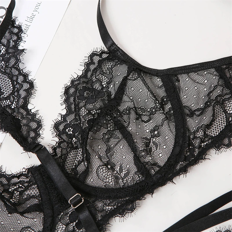 Женское нижнее белье, комплект из 4 предметов, чувственное Прозрачное нижнее белье, Хит, Эротический бюстгальтер, стринги, комплект с подвязками, порно, сексуальные кружевные костюмы, Babydoll