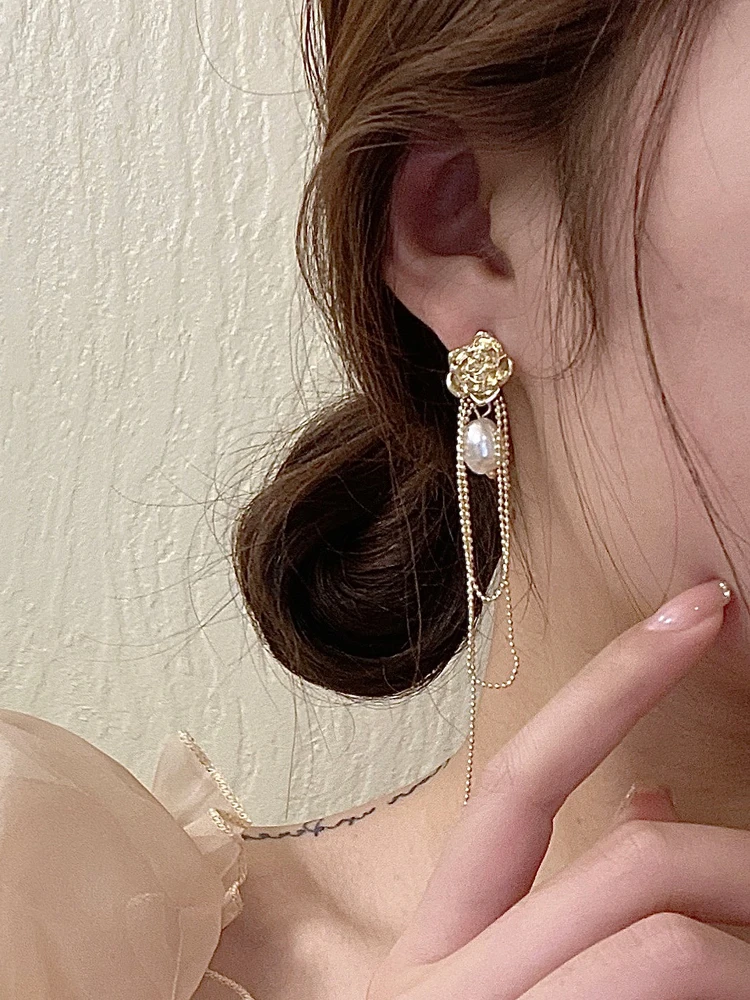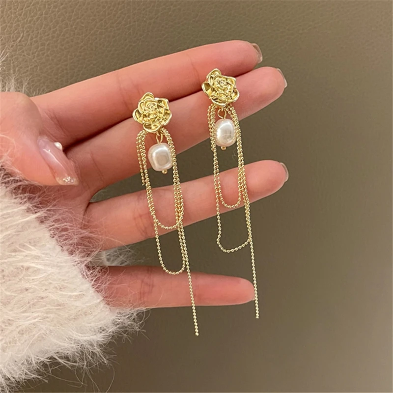 Kshмир 2022 новые металлические золотые длинные кисточки, металлическая многослойная цепочка с розой, модные жемчужные серьги для девочек, серьги, аксессуары, подарок