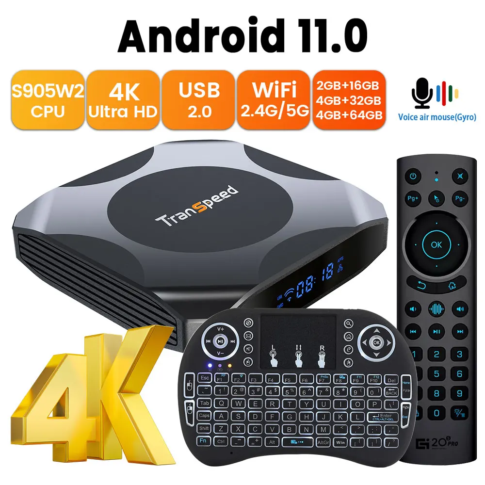 Transpeed Amlogic S905W2 Android 11 приставка для ТВ 4 Гб Оперативная память 64 Гб оперативной памяти, 32 Гб встроенной памяти, BT5.2 100 м 3D двухъядерный процессор Wi-Fi 4 к HD медиаплеер Set top TV BOX приставка для ТВ
