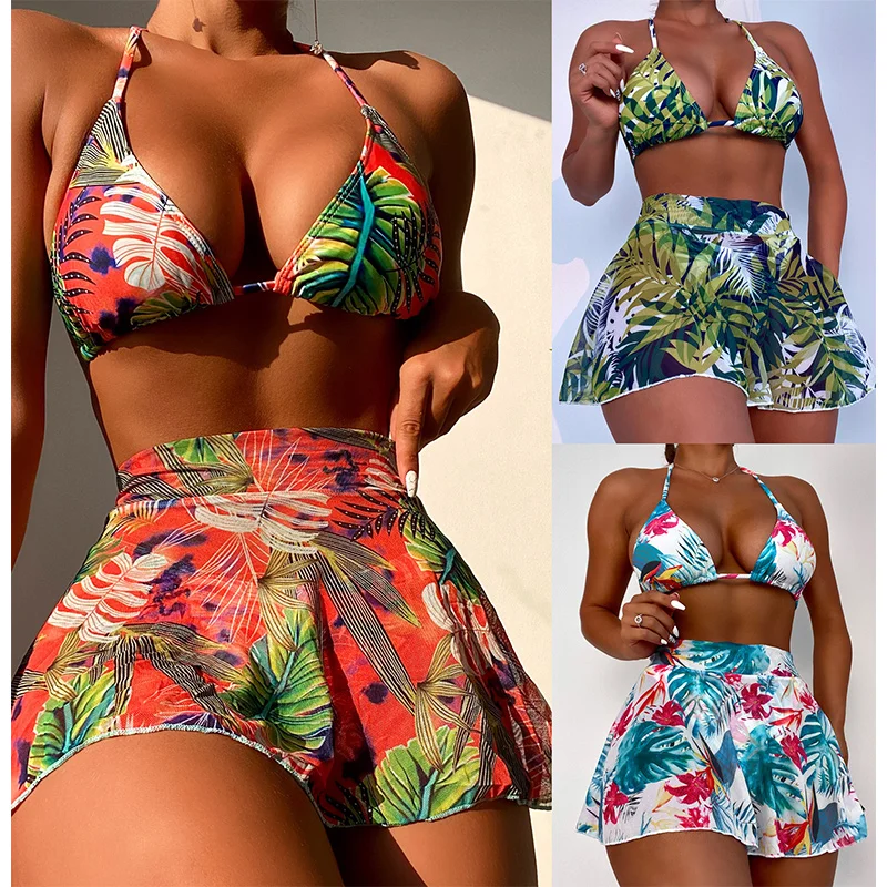 Комплект бикини COOBBU из трех предметов с лямкой на шее и юбкой, женский купальник с оборками, бикини с принтом листьев, пляжная одежда с пуш-ап, купальный костюм