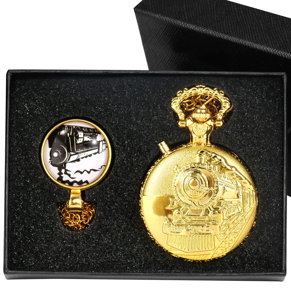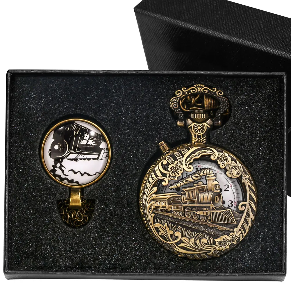 Карманные часы ожерелье Подарочный набор роскошные светящиеся светодиодные кварцевые карманные часы в стиле ретро бронза стимпанк Поезд Локомотив двигатель Fob часы
