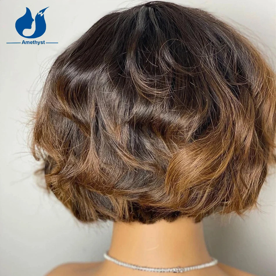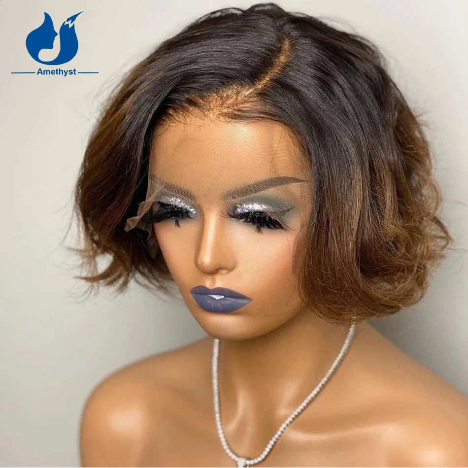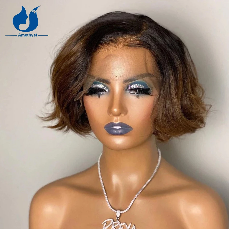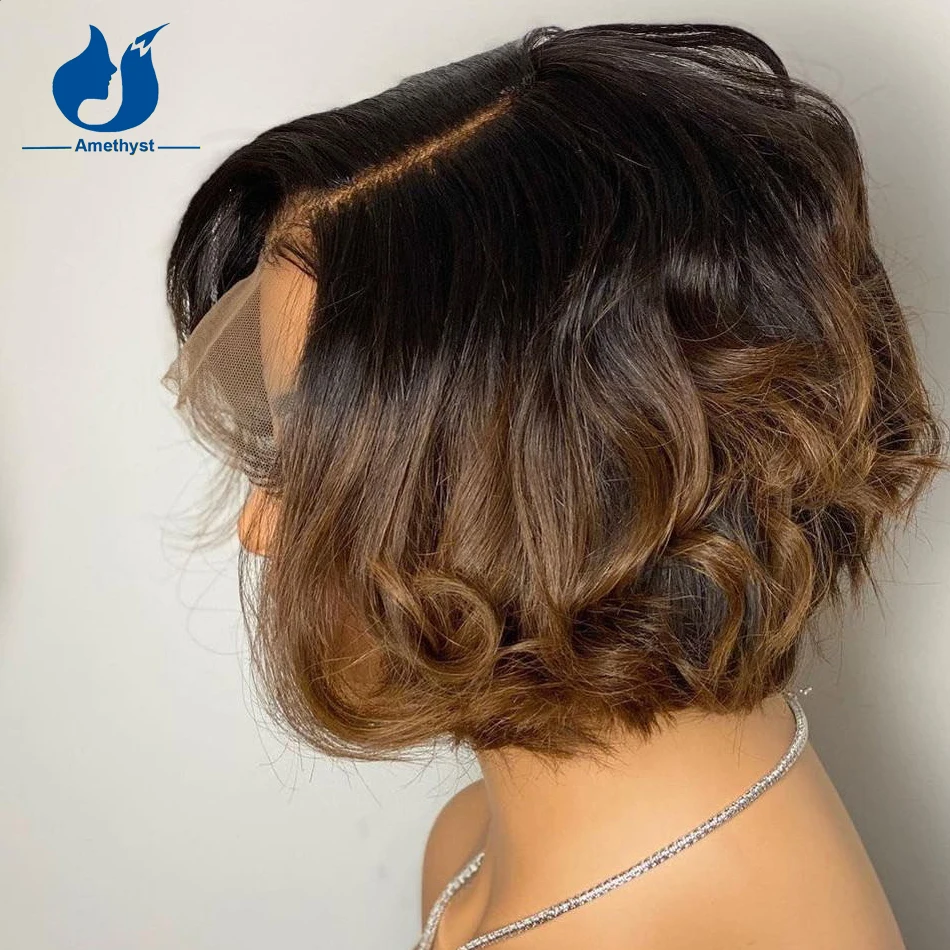 Парик с аметистом Омбре из коричневых T-частей, парик из человеческих волос с боковой частью, парики боб, изогнутые яйца, медовая блондинка для черных женщин, без клея, предварительно выщипанные