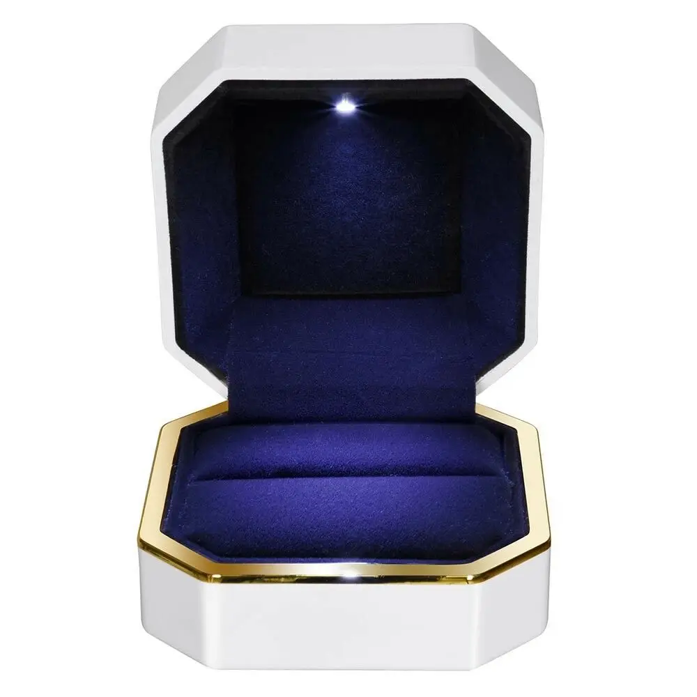 Характеристика:Стильный и роскошный дизайн, фортепианная живопись делает яркий и блестящий внешний вид, золотое покрытие на краю открытого чехла выглядит великолепно и священно, светодиодный светильник instal светодиодный в верхней части верхней крышки, светодиодный светильник автоматически открывается, когда крышка открыта, и будет закрыта при закрытии. Питание от аккумулятора (в комплекте) до 8 часов, эффект прожектора, прямое освещение на алмазе для потрясающих сверкающих эффектов, может держать 2 кольца, И внутренний бархат защищает кольцо от царапин и фиксируется на месте, портативный, легко носить с собой, лучший помощник для предложения и участия продукта
