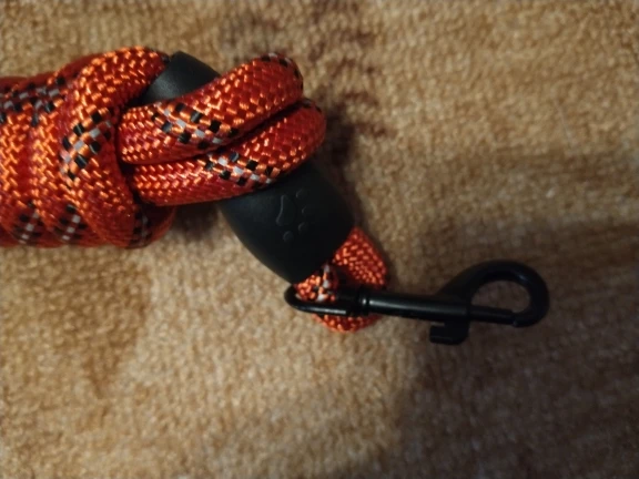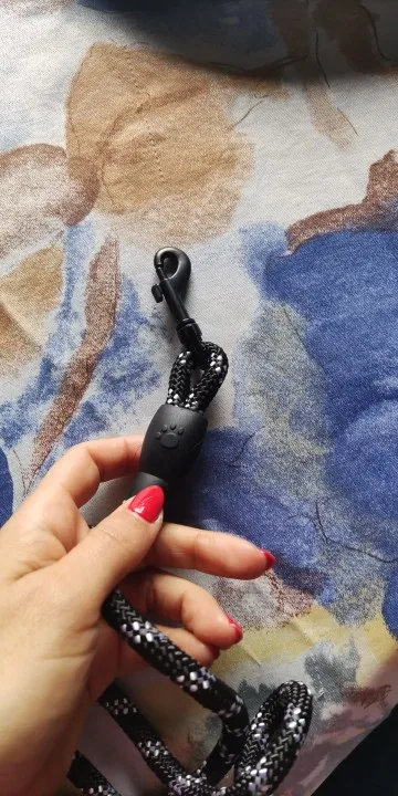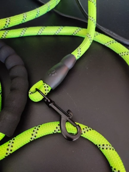 Поводок толстый, прочный. При натяжении слегла растягивается. За неделю использования показал себя отлично. Вдоль поводка прошивка из светоотражающих нитей, из-за чего в темноте возникает лёгкий эффект свечения. Из нареканий - на мой взгляд маловат карабин для такого мощного поводка