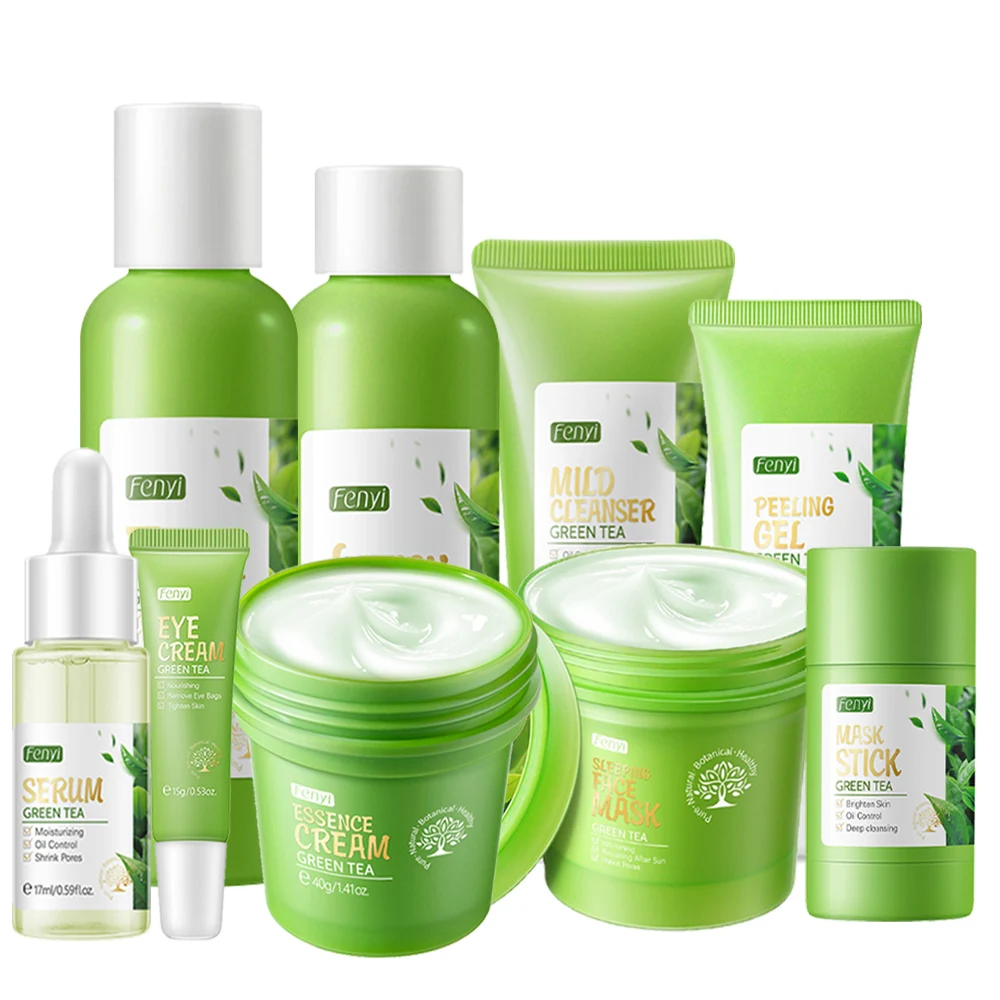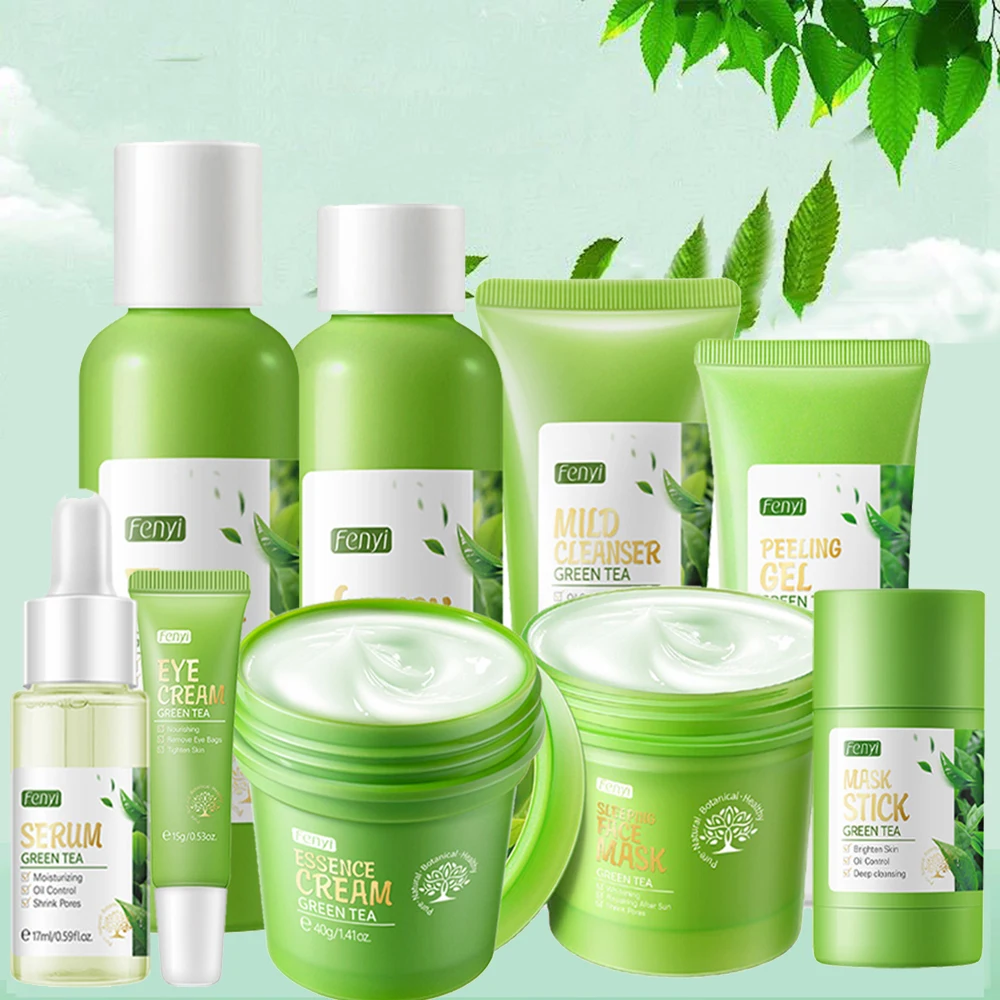 Наборы для ухода за лицом с зеленым чаем, увлажняющий крем для лица с контролем жирности, Отшелушивающий гель против акне, укрепляющий питательный крем для глаз, набор для ухода за красотой