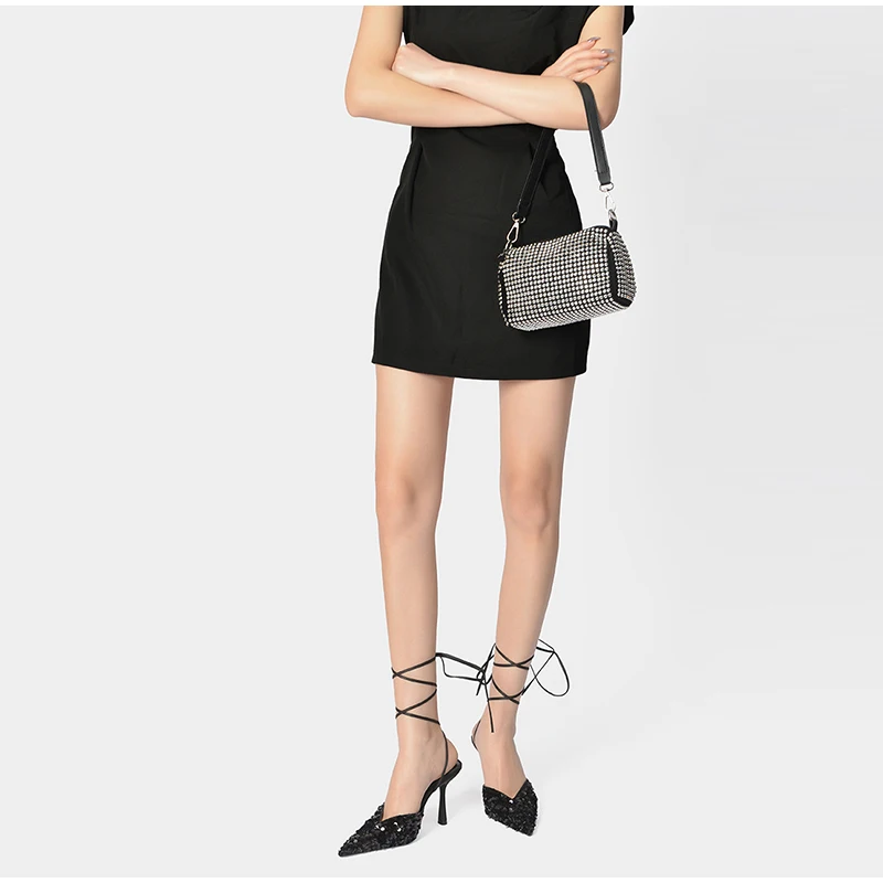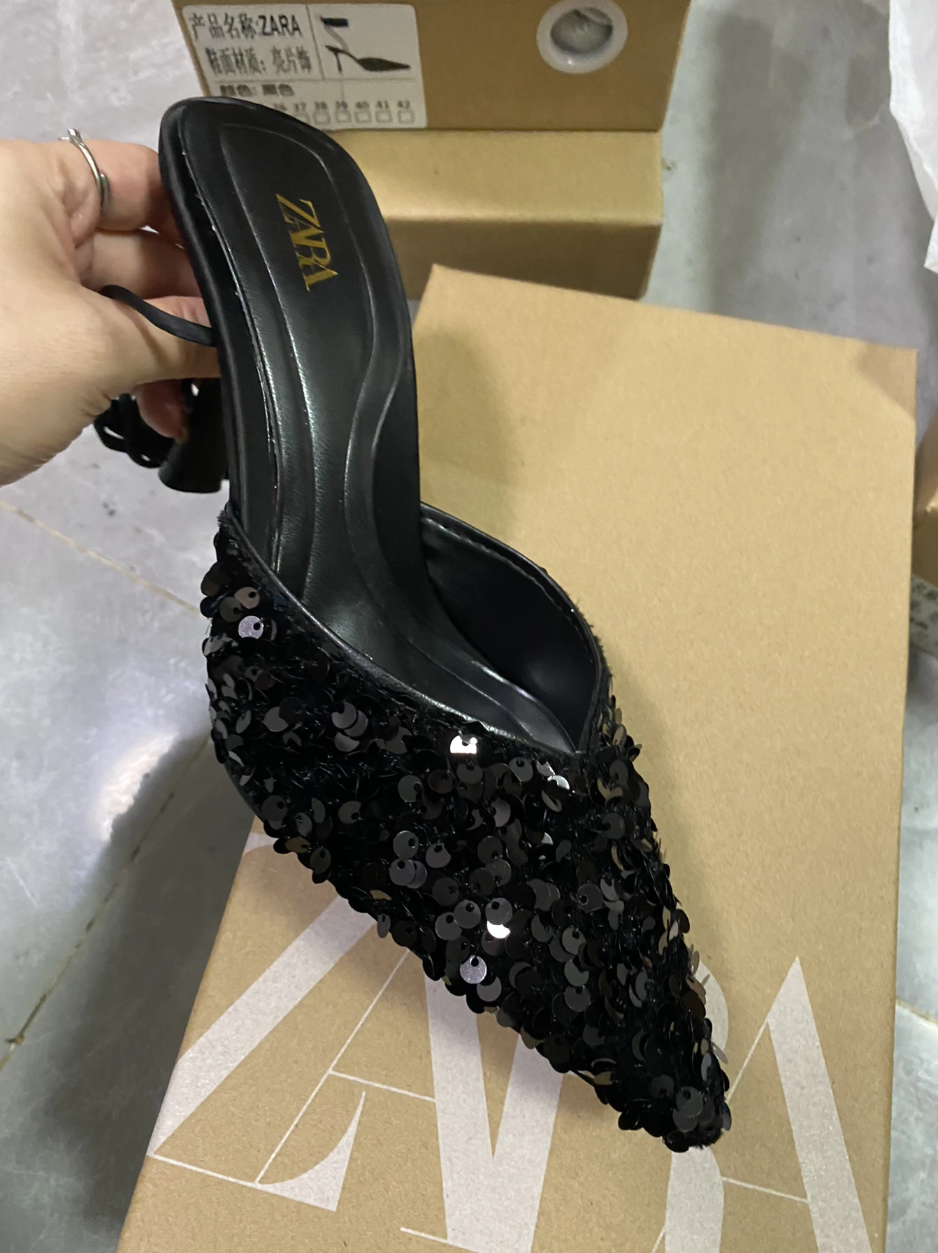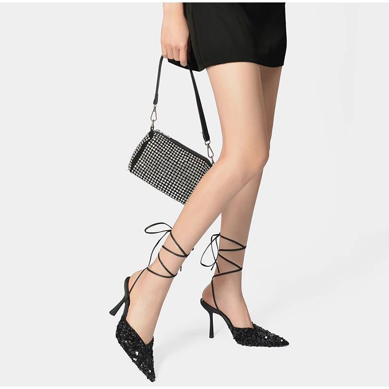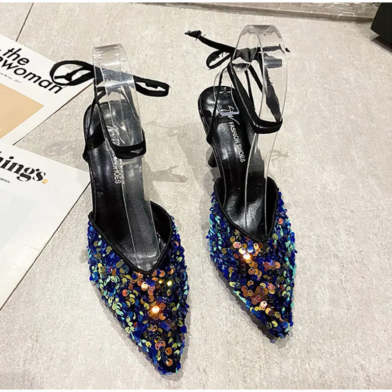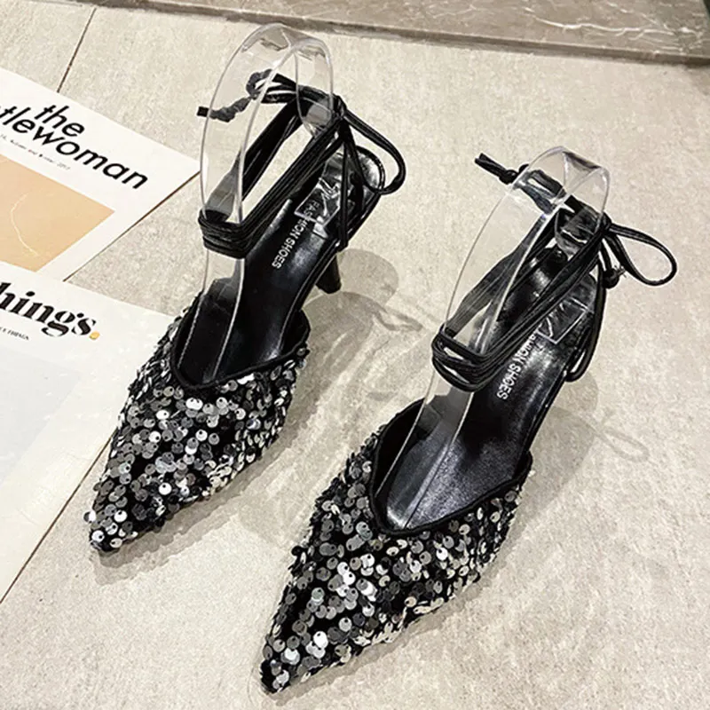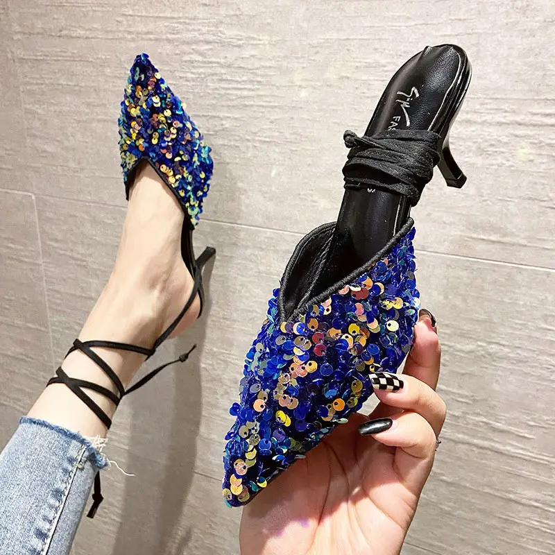 Женские босоножки с блестками, туфли без задника на тонком каблуке с острым носком и ремешком на щиколотке, вечерние туфли, 2022