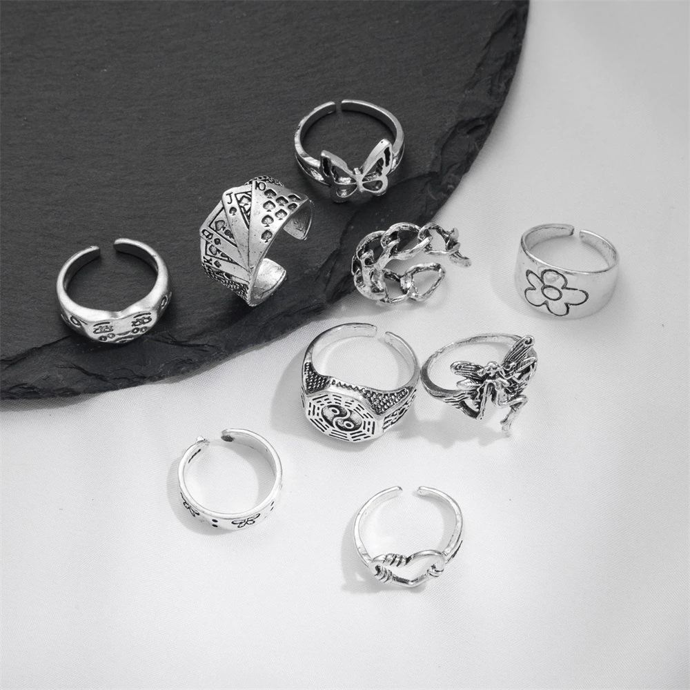 Набор колец в готическом стиле для мужчин и женщин, комплект из 9 предметов в винтажном стиле, кольца на палец в стиле ретро, с большим углублением цветов, для подарка