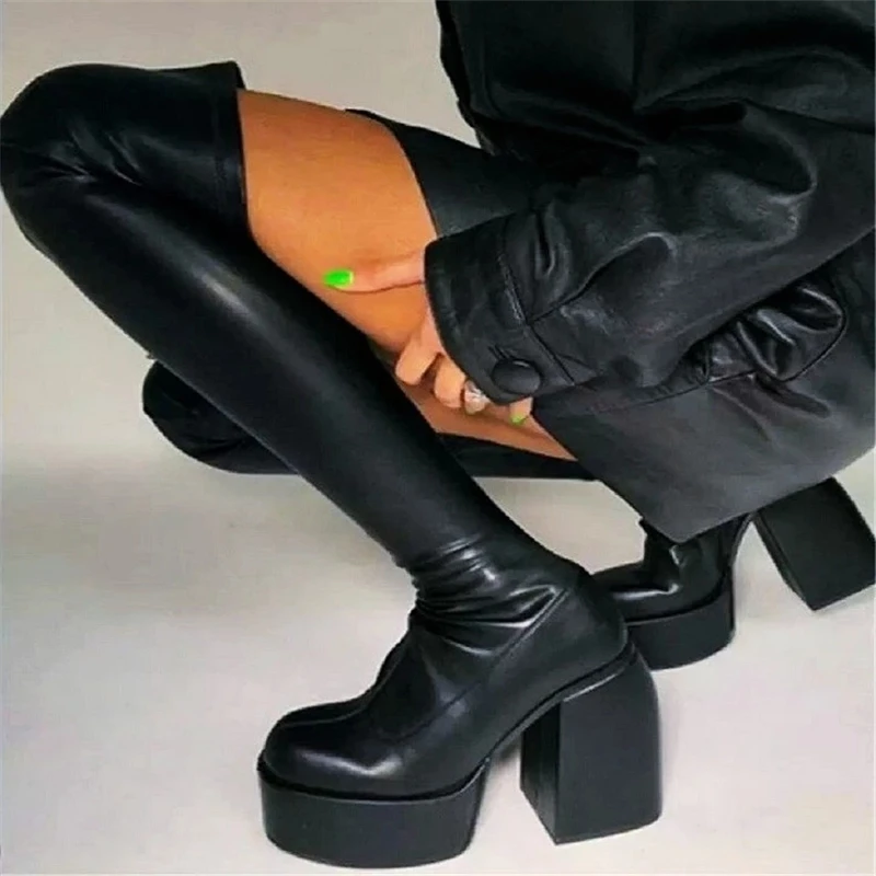 Женские сапоги из микрофибры, черные высокие сапоги до колена на толстой платформе и высоком каблуке, в стиле панк, осеньзима