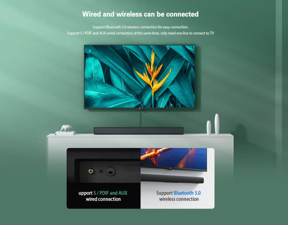Проводное и беспроводное подключениеПоддержка беспроводного подключения Bluetooth 5,0 для легкого подключения. Поддержка S / PDIF и AUX проводное соединение одновременно, нужна только одна линия для подключения к телевизору* Поддержка проводного соединения S / PDIF и AUX* Поддержка беспроводного подключения Bluetooth 5,0