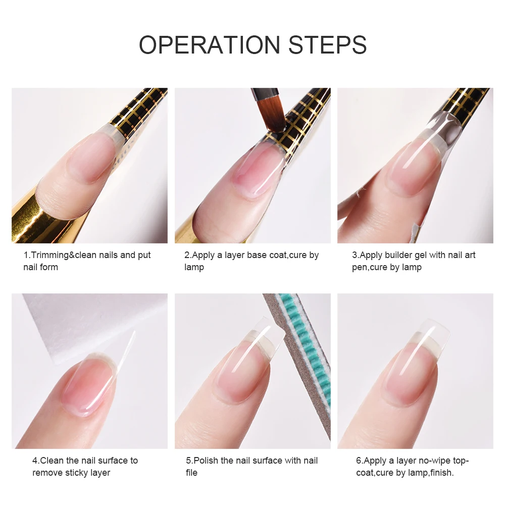 1. Очистите ногти, затем нарежьте и обрежьте поверхность ногтей.2. Сначала нанесите Базовое покрытие, затем закрепите УФ/светодиодную лампу.3. Нанесите Гель-лак непосредственно, вылечите УФ-лампой в течение 2 минут или светодиодный светильник в течение 60 с.4. Нанесите 2-й слой и снова закрепите УФ/светодиодную лампу.5. Пальто с верхним покрытием, которое может сделать гвоздь высоким блеском, а затем высушить с УФ/светодиодной лампой.6. Удалите липкий остаток на ногтях с помощью очищающего средства.