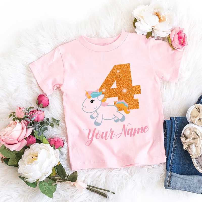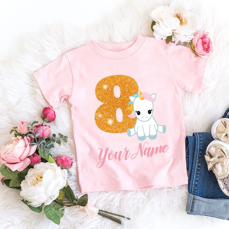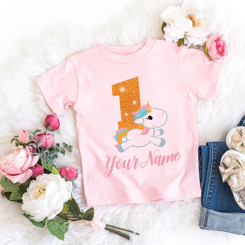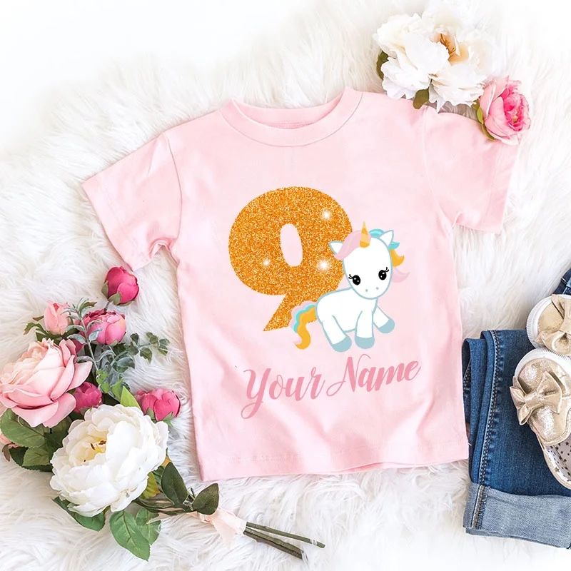 Футболка с именем на заказ для дня рождения, милая мультяшная футболка с единорогом для девочек 1-9, летние детские топы, детская Милая футболка, одежда