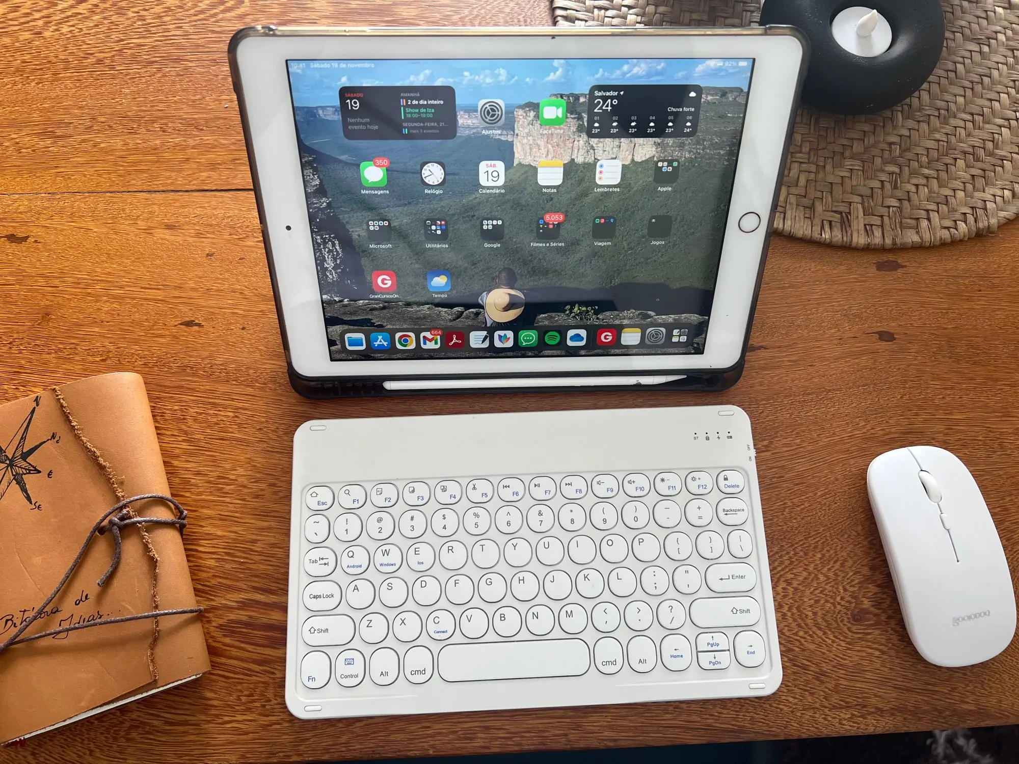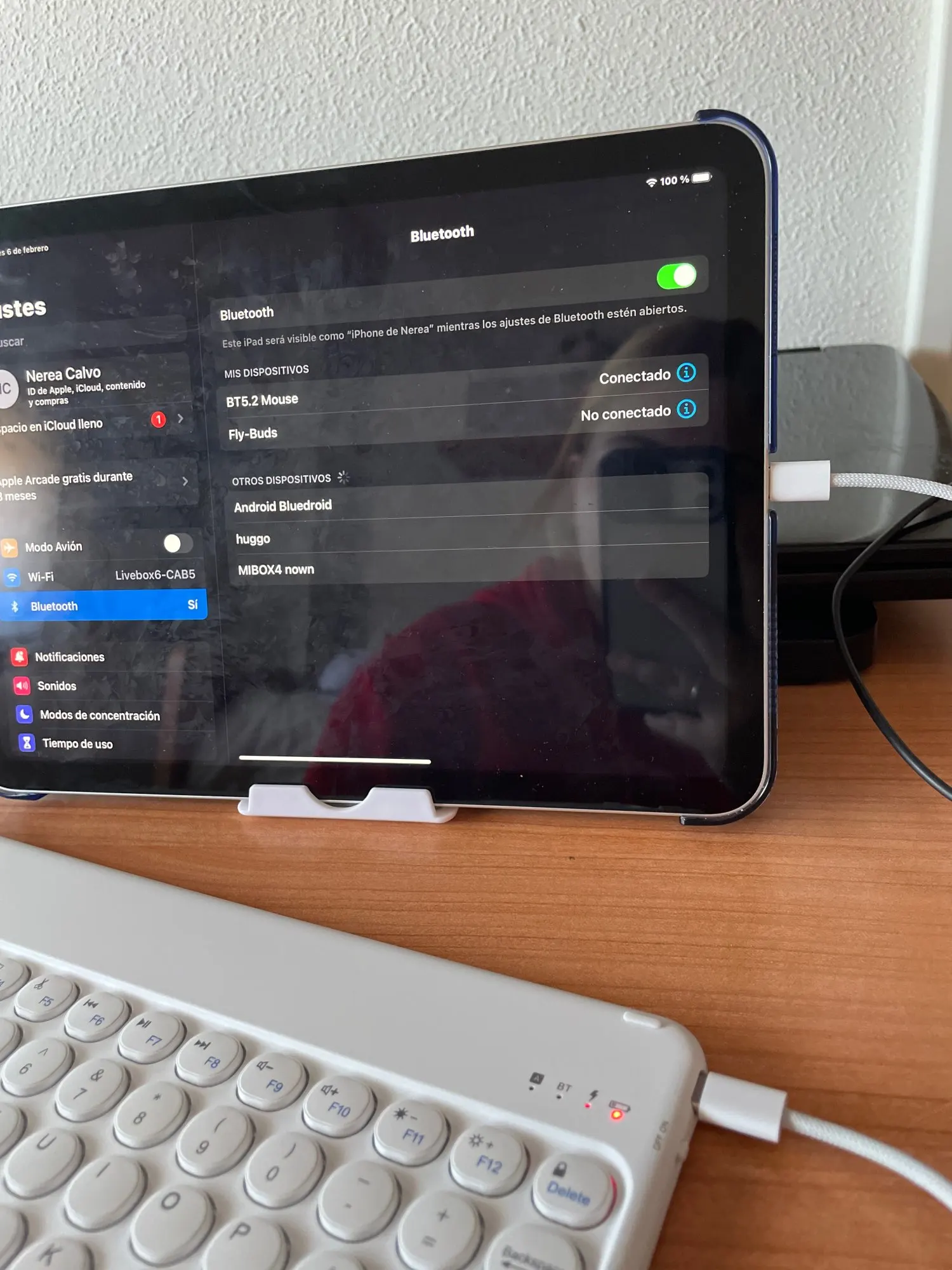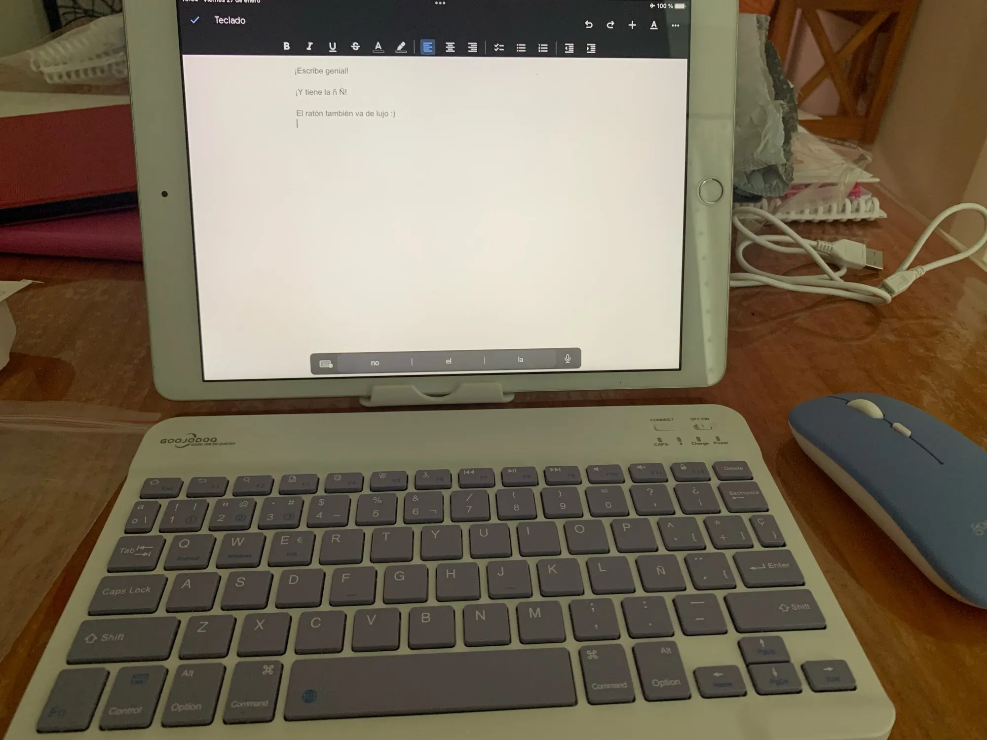 Это то же самое, что и фотографии, у него нет проблем с подключением к iPad (хотя он поставляется с другим именем, чем указано в брошюре); Мышь соответствует тем же характеристикам. Поддержка, с которой он поставляется, довольно практична и удобна, хотя у нее не так много уровней позиций, он выполняет свою функцию правильно. Единственная деталь в том, что когда вам нужно написать большие количества текста, он становится медленным, ответ не очень быстрый, но соотношение цены и качества очень хорошее.