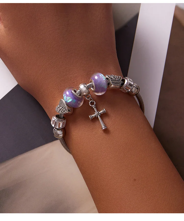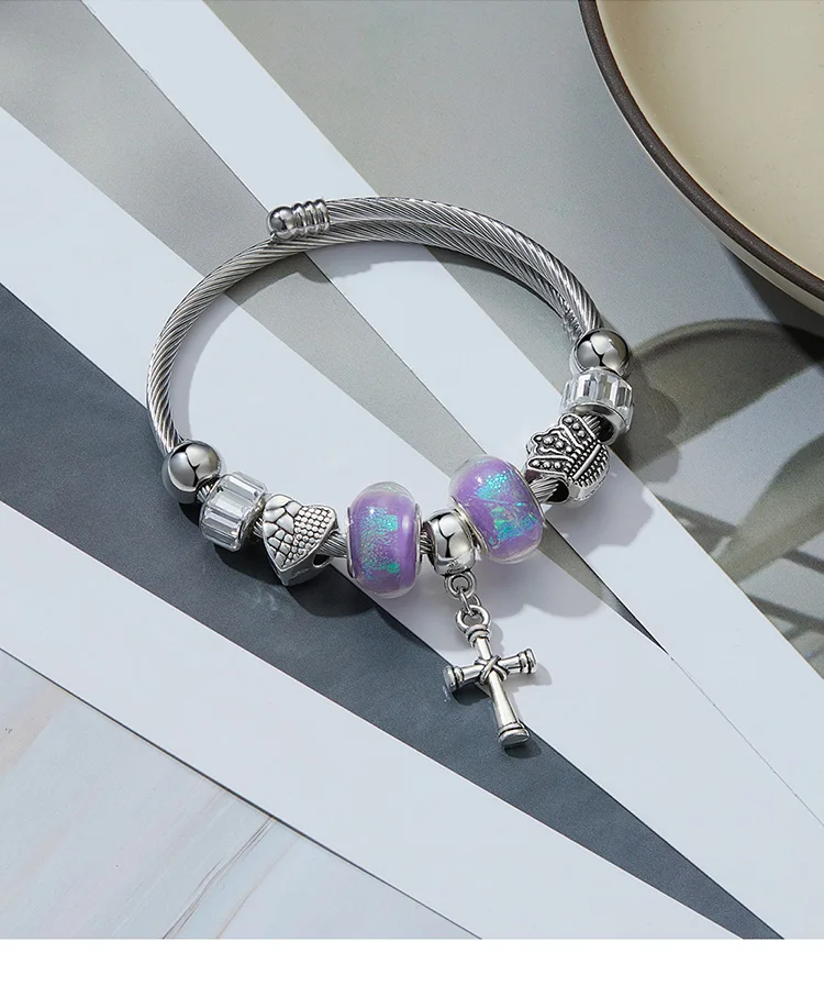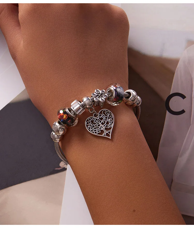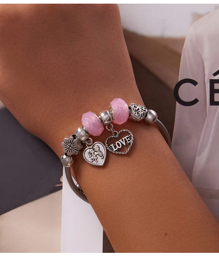 Браслеты-подвески с сердечками для влюбленных пар❤[Опишите] серебряный браслет с подвеской в виде влюбленной пары и полой подвеской в виде любви-это мило и романтично. Он стильный и уникальный с красивыми розовыми стеклянными прокладками и изысканным клевером и подвесками в форме сердца. Размер может быть скорректирован, что удобно носить.❤[Параметры]: Внутренний диаметр: 5,1 см (регулируемая), толщина: 0,3 см❤[Материал]: экологически чистый сплав + нержавеющая сталь + стеклянный шарик❤[Для подарка] 1 браслет и Подарочный мешочек, который является идеальным подарком.