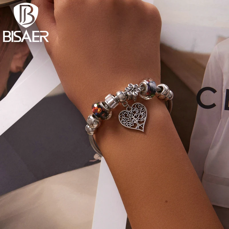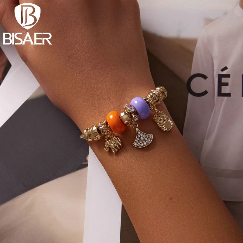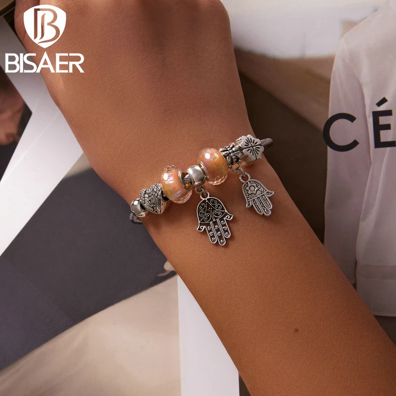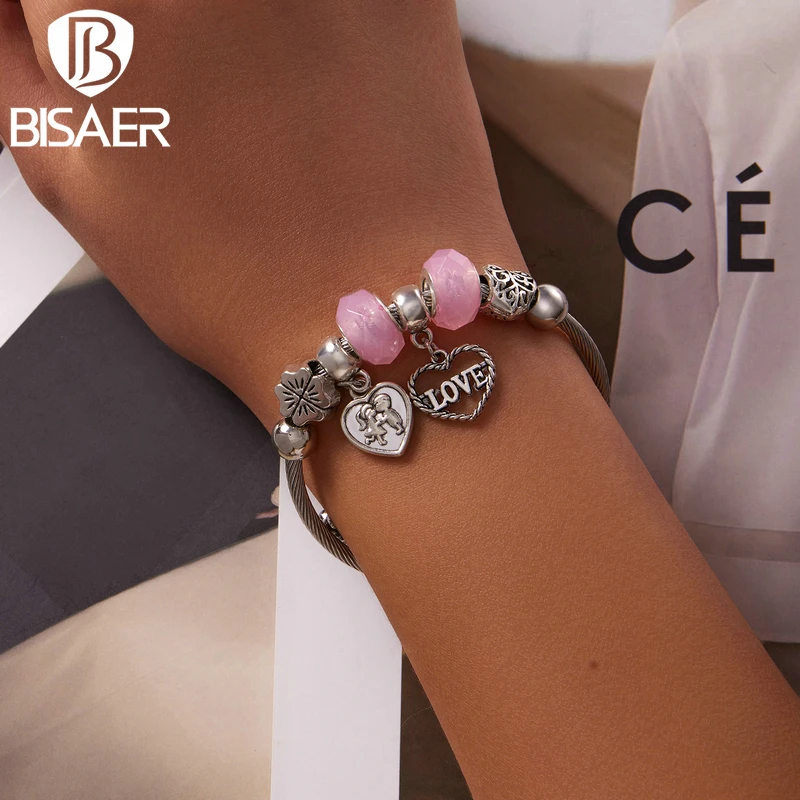 Браслеты-подвески BISAER для влюбленных пар, подвески, искусственные розовые бусины для женщин, DIY брендовые браслеты, ювелирные изделия AIB017