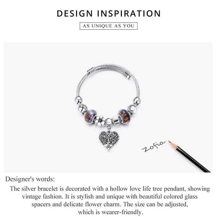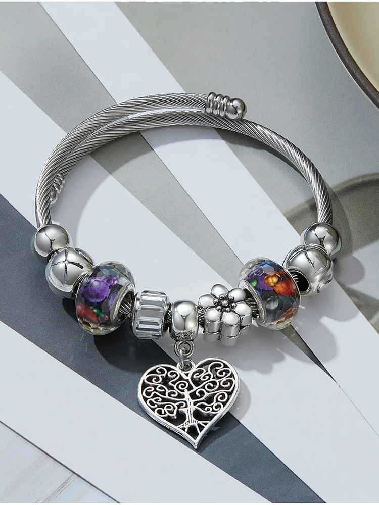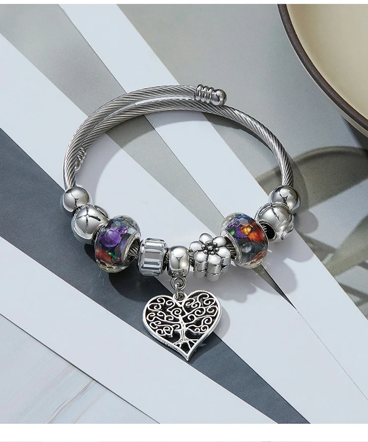 ❤[Опишите] Серебряный браслет украшен полой любовью подвеска с деревом жизни, показывая винтажную моду. Он стильный и уникальный с красивыми цветными стеклянными прокладками и нежным цветочным шармом. Размер может быть скорректирован, что удобно носить.❤[Параметры]: Внутренний диаметр: 5,1 см (регулируемая), толщина: 0,3 см