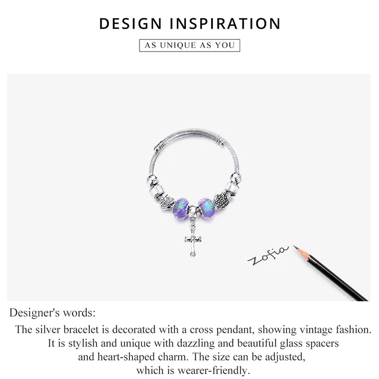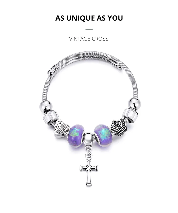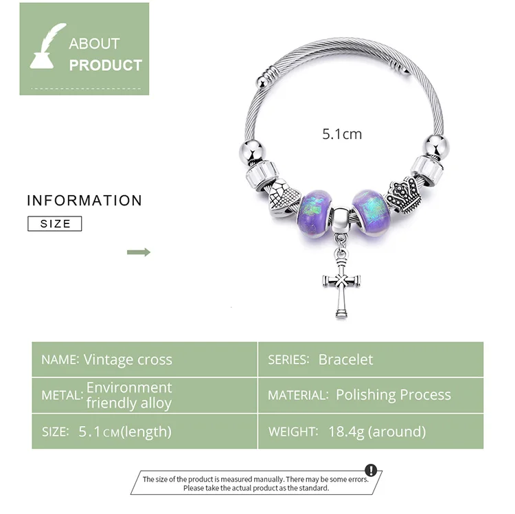 ❤[Опишите] Серебряный браслет украшен подвеской в виде креста, демонстрирующей винтажную моду. Он стильный и уникальный с ослепительными и красивыми стеклянными прокладками и шармом в форме сердца. Размер может быть скорректирован, что удобно носить.❤[Параметры]: Внутренний диаметр: 5,1 см (регулируемая), толщина: 0,3 см