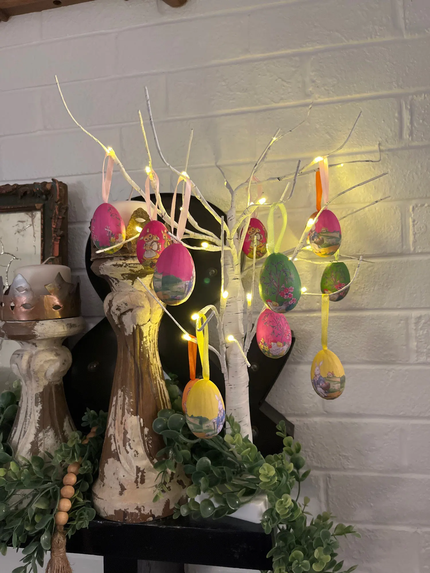 Очень красивое пасхальное украшение. Хорошее качество. Отличные цвета и иллюстрации! Упругий, но небольшой вес. Не сгибает нежные веточки. Очень проста в обращении. Я очень рад. (Одно из многих яиц прибыло с незначительной вмятины, но это хорошо.)