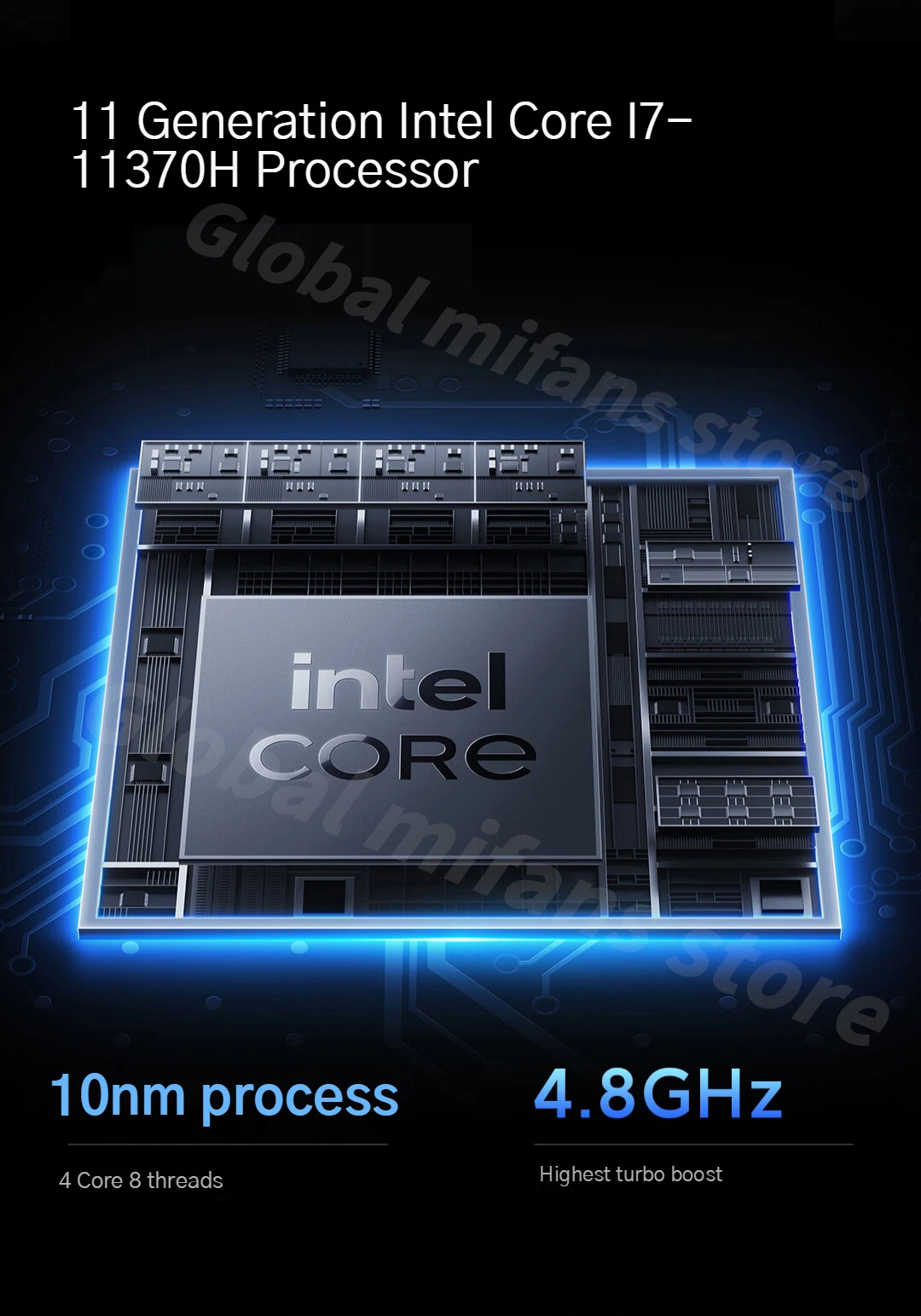 Intel 11-го поколения®Сердечник™I7-11370H процессорОснование турбо частота 3,3 ГГцСамая высокая частота ядра 4,8 ГГцЧетырехъядерный и восьминиточный процессорКэш L3 12 МБ