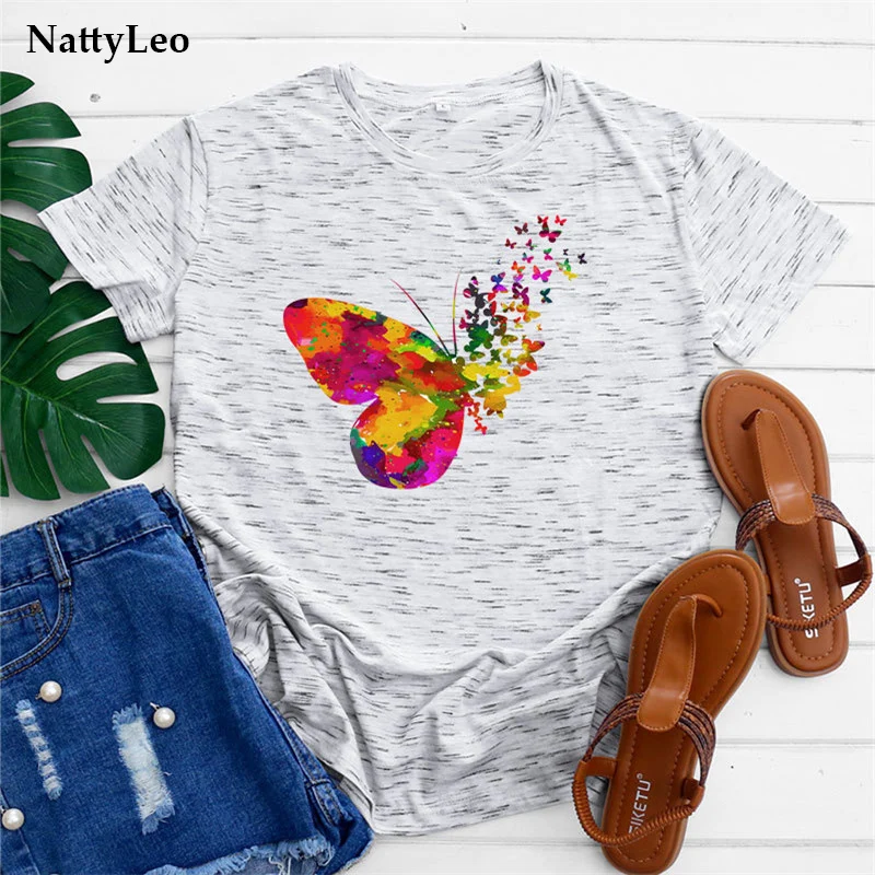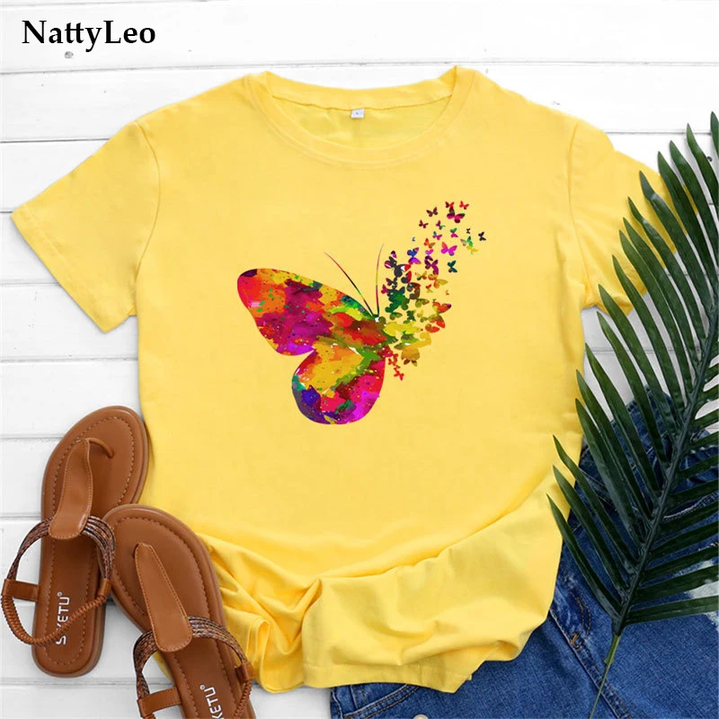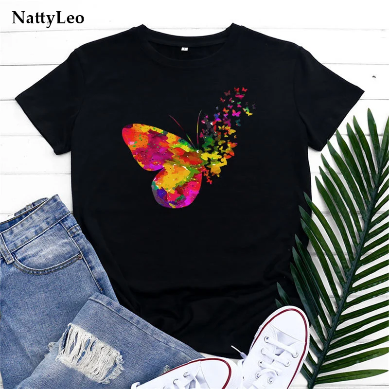 Женская футболка с принтом бабочек, черная Дизайнерская футболка с круглым вырезом и коротким рукавом, из 2022 хлопка, на новый год 100%